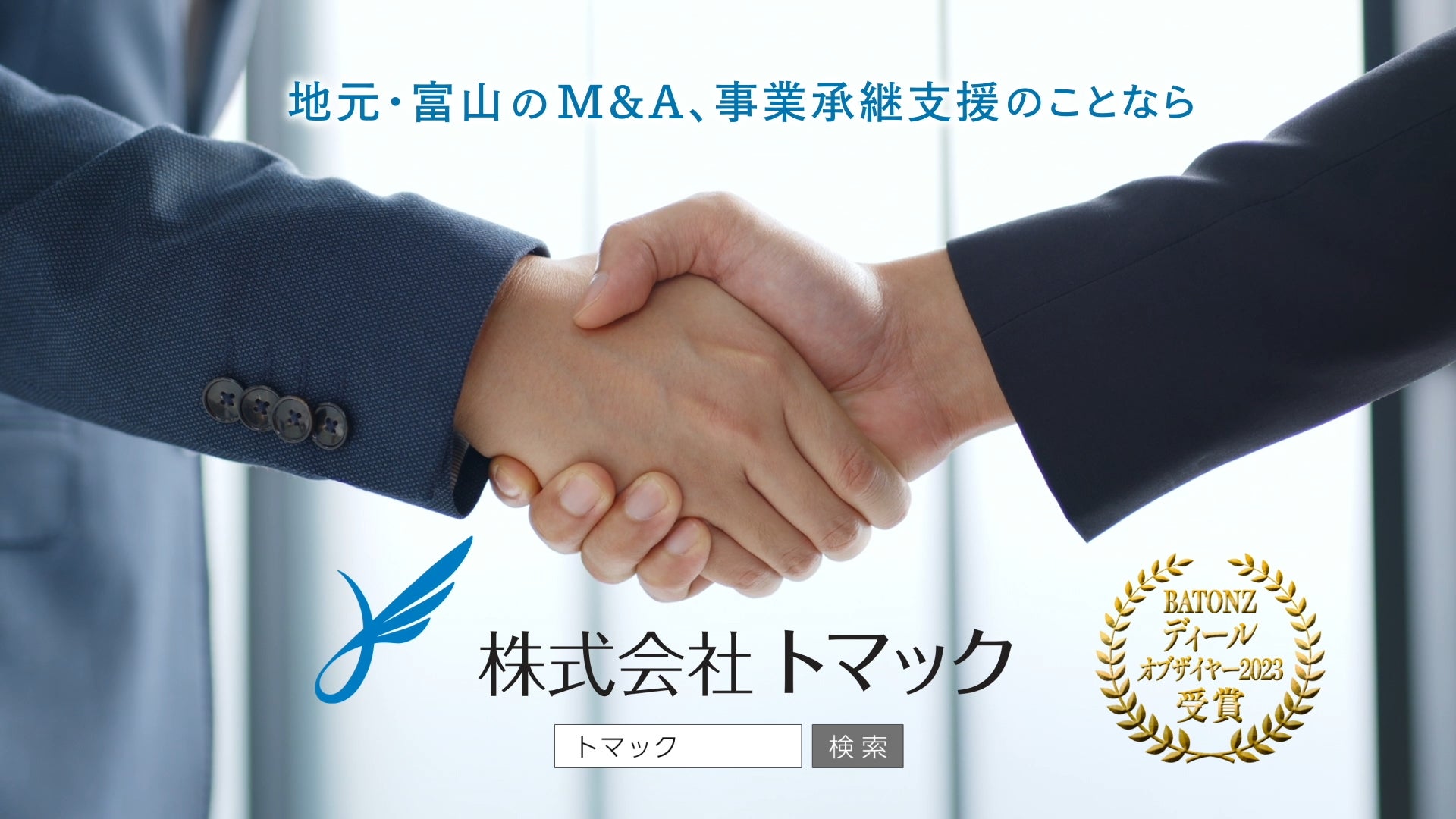 M&A・事業承継支援の株式会社トマック(本社:富山県高岡市、代表取締役:坂井右文)は北陸(富山・石川・福井)を中心に、中小企業のM&A仲介を行っています。この度、新TVCM「後継者探しならトマック」編(15秒)を2024年5月5日(日)より富山テレビ放送で放映開始します。