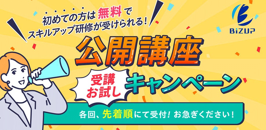 総合型研修サービスを提供する株式会社ビズアップ総研(本社:東京都港区、代表取締役:吉岡高広)は、「対面」と「オンライン」両方に対応した「公開講座」で、2024年12月の対象講座を無料もしくは半額で受講できるキャンペーンを開催いたします*1。