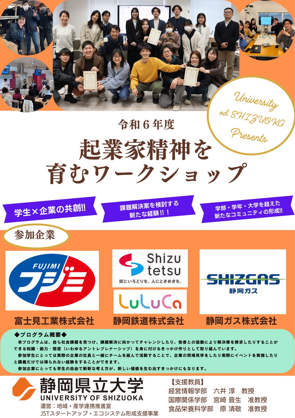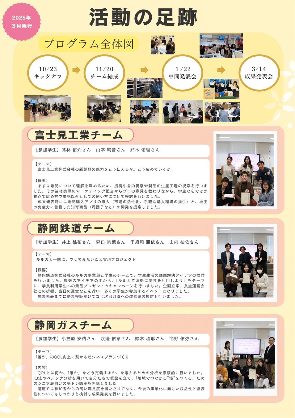 静岡県立大学の学生が中心となり、富士見工業株式会社・静岡鉄道株式会社・静岡ガス株式会社の3社と協働して、社会や企業が抱える課題の解決に挑戦する実践型のワークショップです。