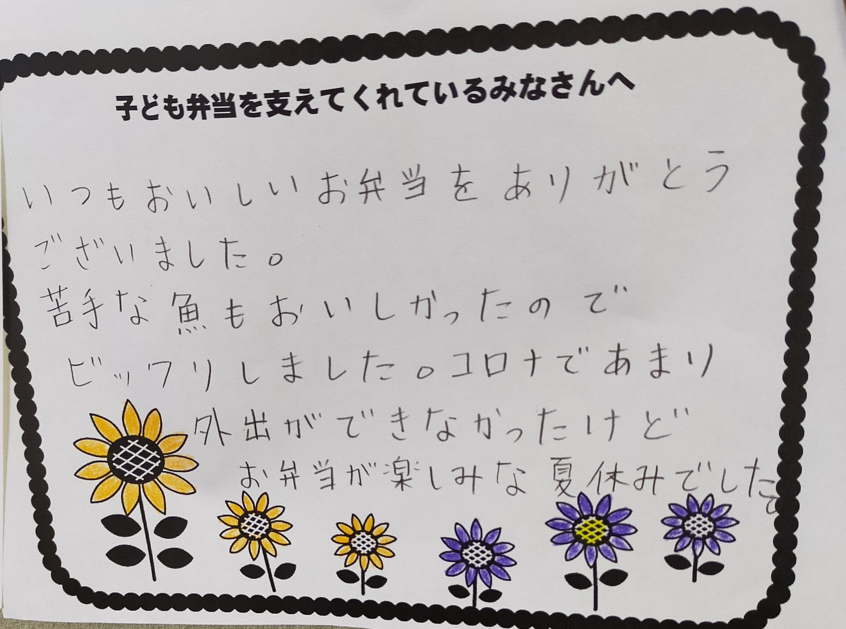 利用した子どもからは「じゃんけんぽんのお弁当が夏休みの楽しみの1つです。ボランティアさんとお話できるのが楽しい。」「いつもおいしいお昼ごはんをありがとうございます。熱中症に気をつけてください。」など、お弁当やボランティアさんとの会話を楽しみにしていること、配達してくれるボランティアさんへの気遣いなどのメッセージが寄せられました。