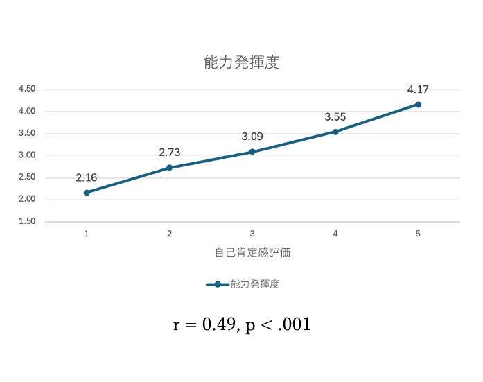 自己肯定感の評価毎に能力発揮度の平均値を算出した結果、下記の通りとなりました。