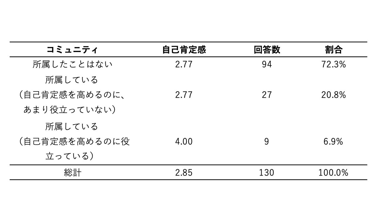 ・自己肯定感を高めるのに役立っていないコミュニティに所属している回答群は、所属したことがないと答えた回答群と自己肯定感の平均値は変わらなかった。(結果③-3)