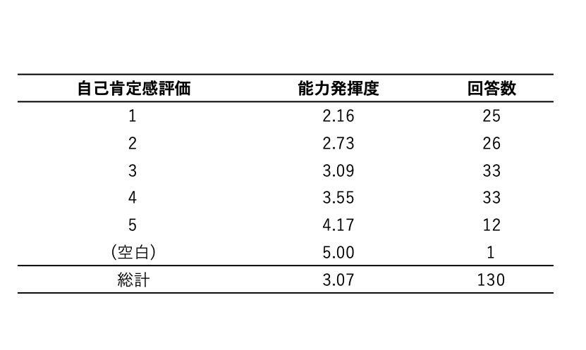 ・自己肯定感を高く評価した回答群ほど能力発揮度の平均値は高くなった。