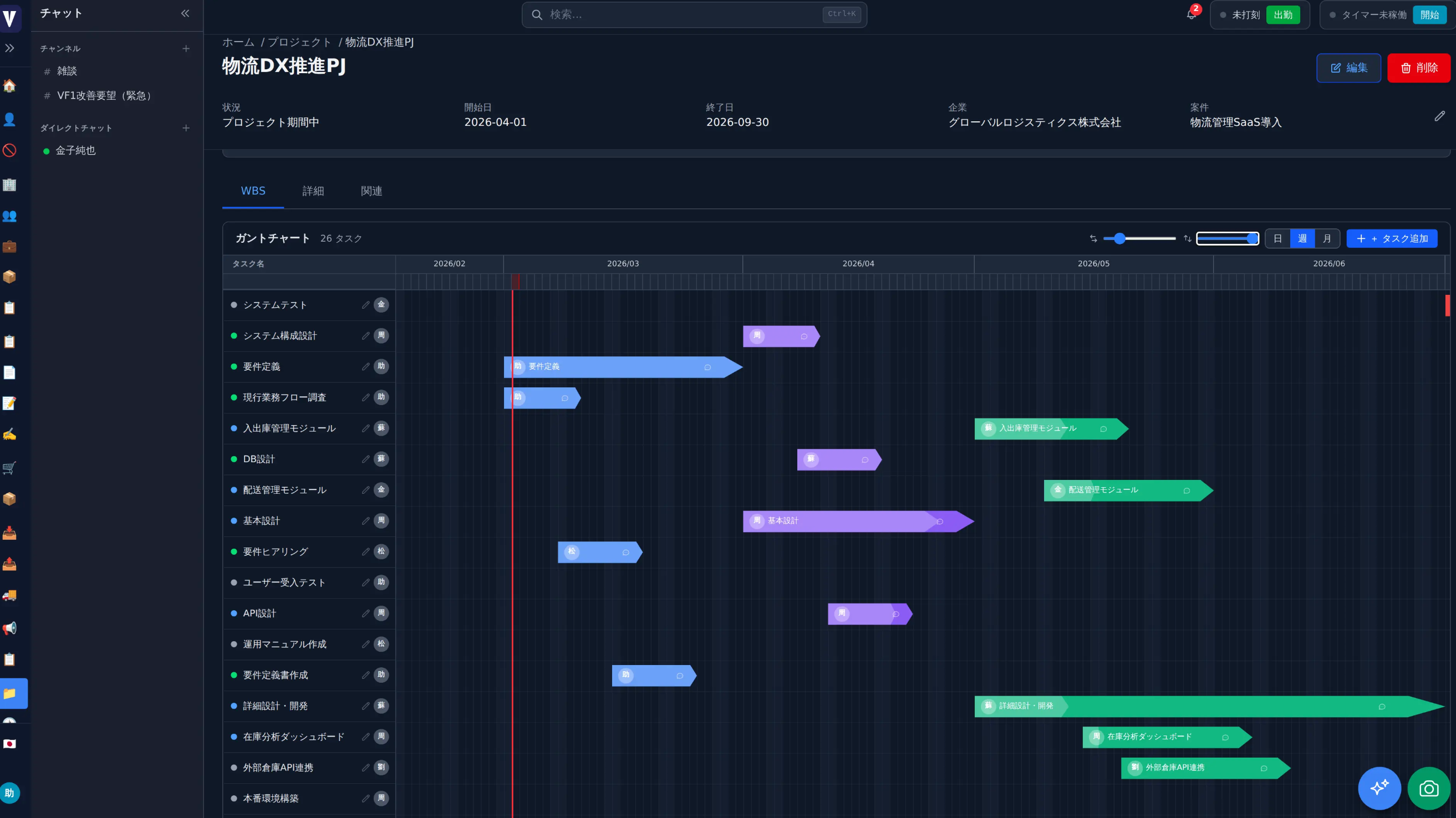 WBS・ガントチャートでプロジェクトの進捗を可視化。タスク管理、勤務管理、工数記録まで一元管理できます。