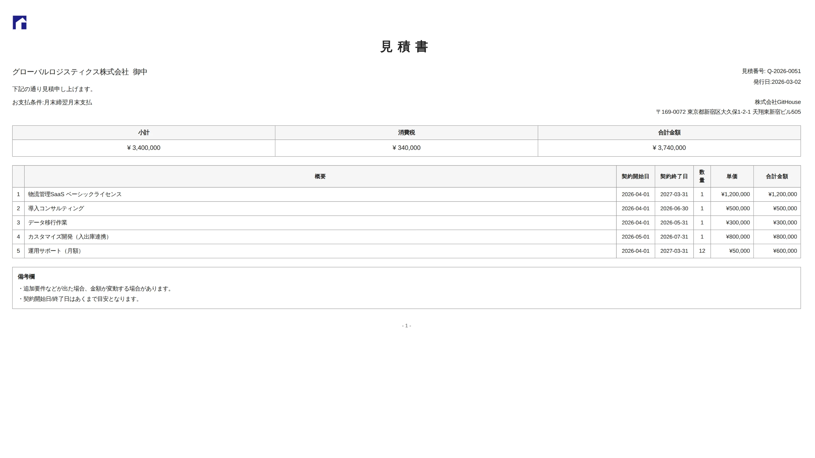 見積書・請求書・契約書・発注書などをシステム内で一括管理。PDF出力に対応し、案件情報と連動した帳票を即座に発行できます。※お客様から帳票フォーマットを頂き、それを弊社側で環境に対して反映する形になります