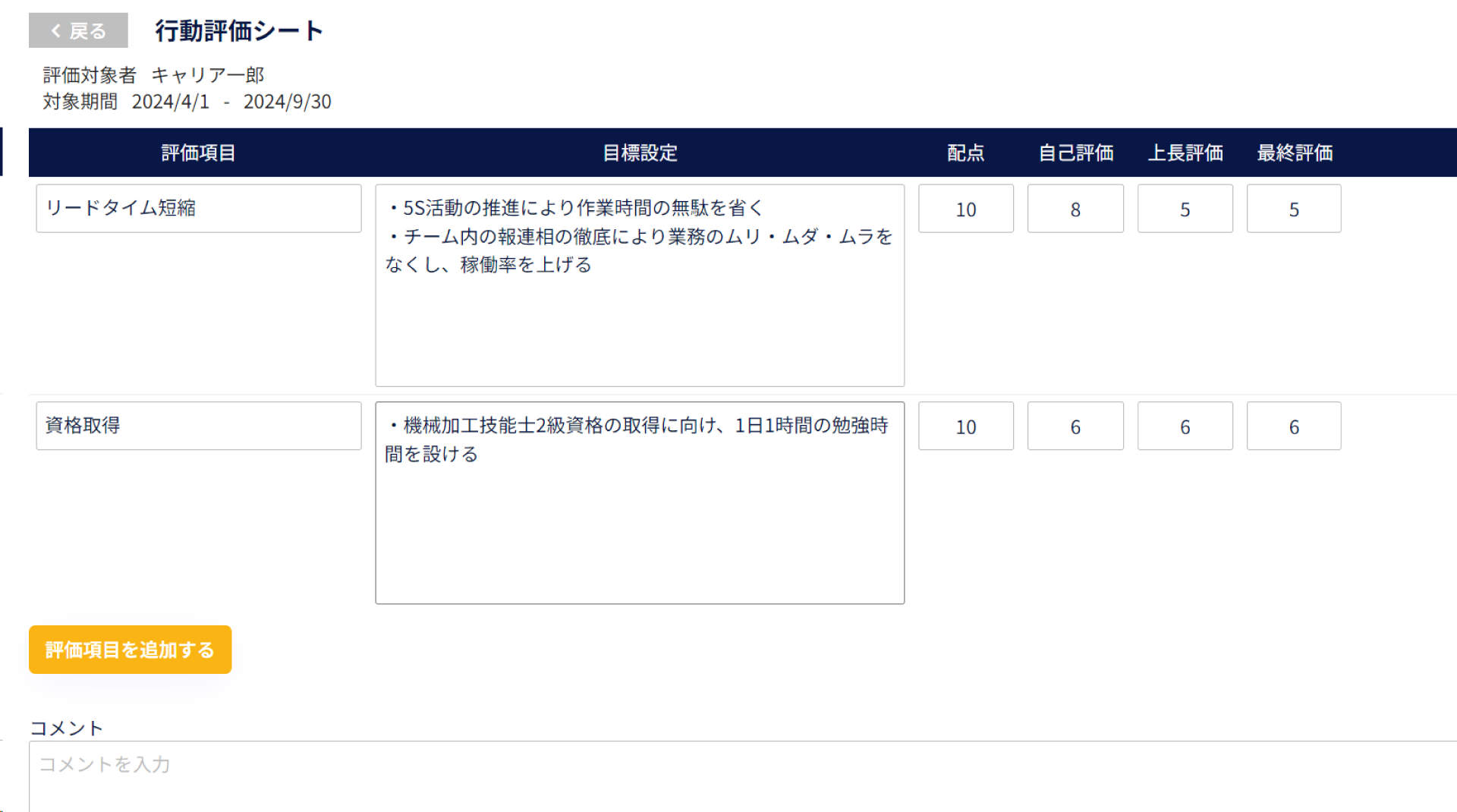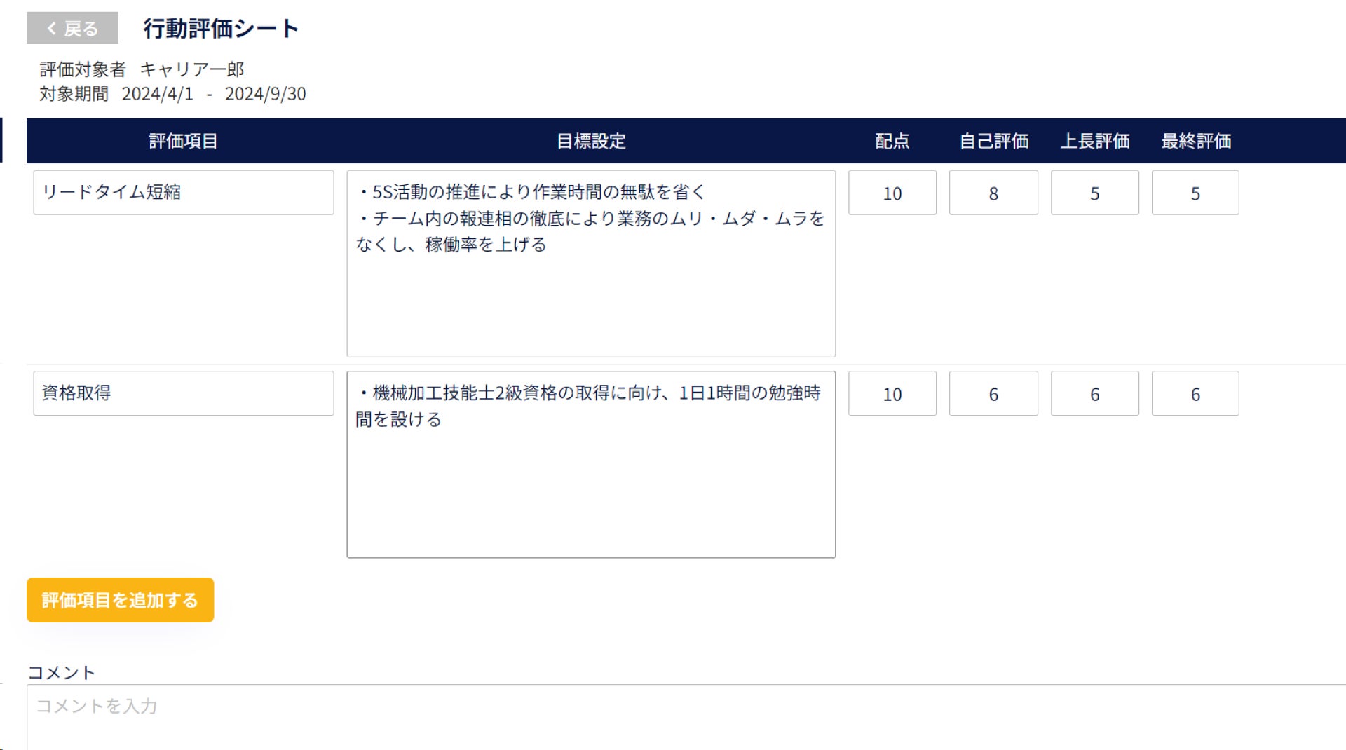 さまざまな評価方法に対応するため、スキル評価と行動評価の2つのテンプレートを用意。部署や業務内容によって最適な評価シートを運用することができます。