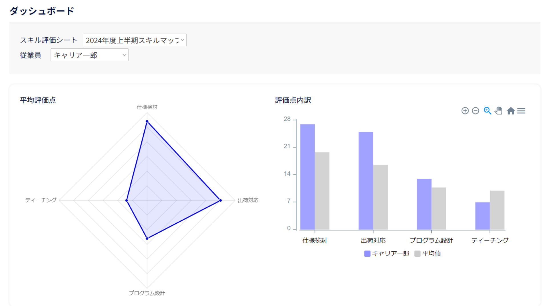 スキル評価での評価結果をもとにさまざまなグラフを自動生成することができます。これにより、社員のスキルを客観的に可視化できるだけでなく、今後育成強化すべきスキル項目を洗い出すことができます。