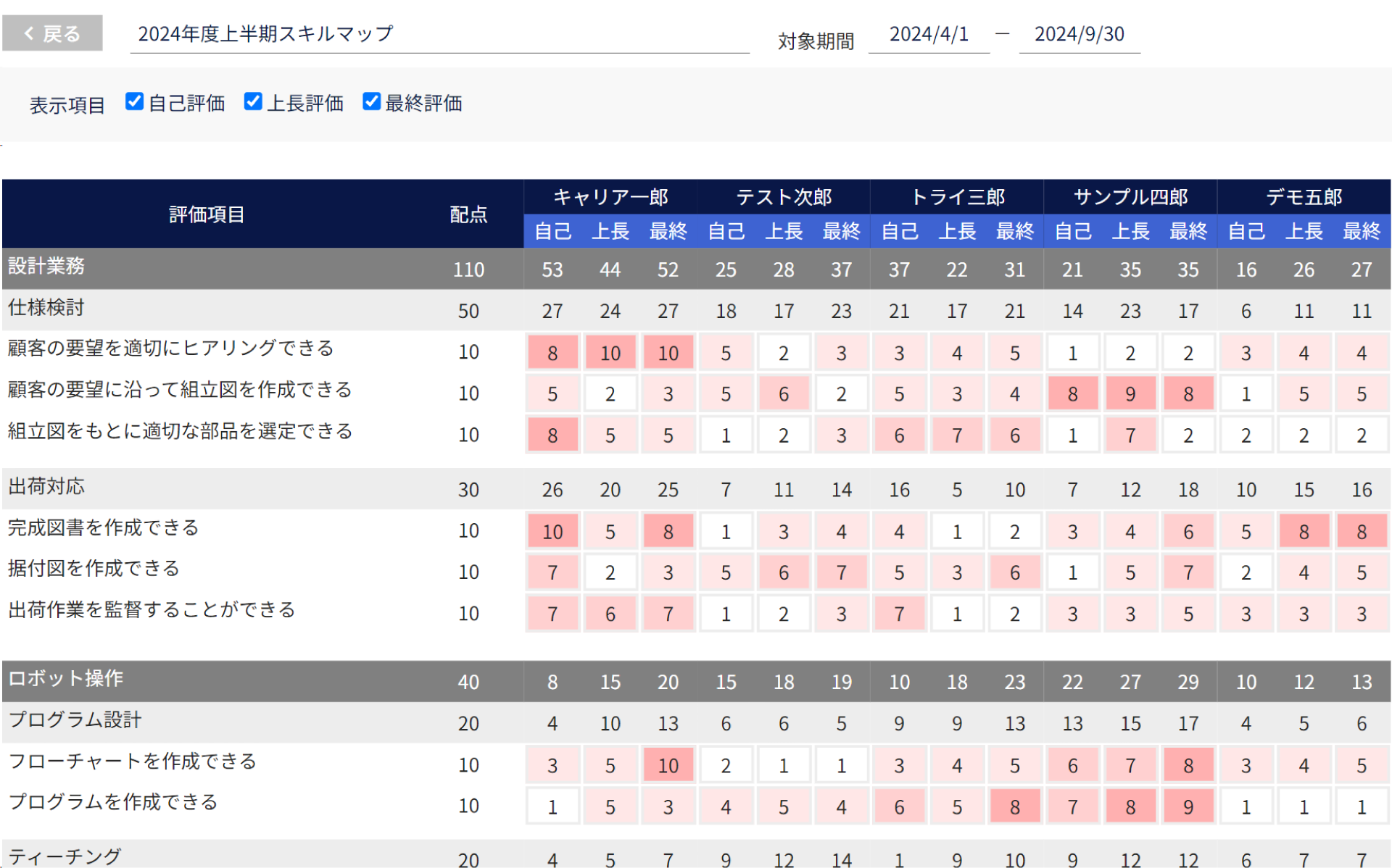 評価の集計作業を省力化できるほか、評価結果のグラフ分析機能により、これまで見えづらかった社内の人材スキルを適切に把握し、人材育成・組織力向上につなげることができます。