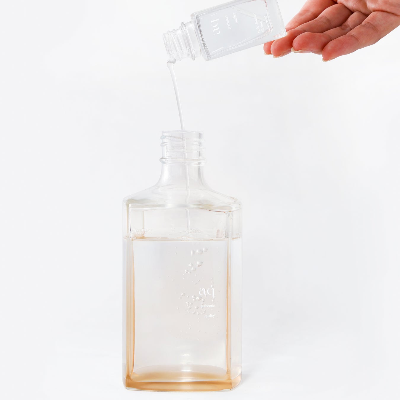 aqのガラスボトル、あるいはお手持ちのボトルに水道水を300mL入れます。