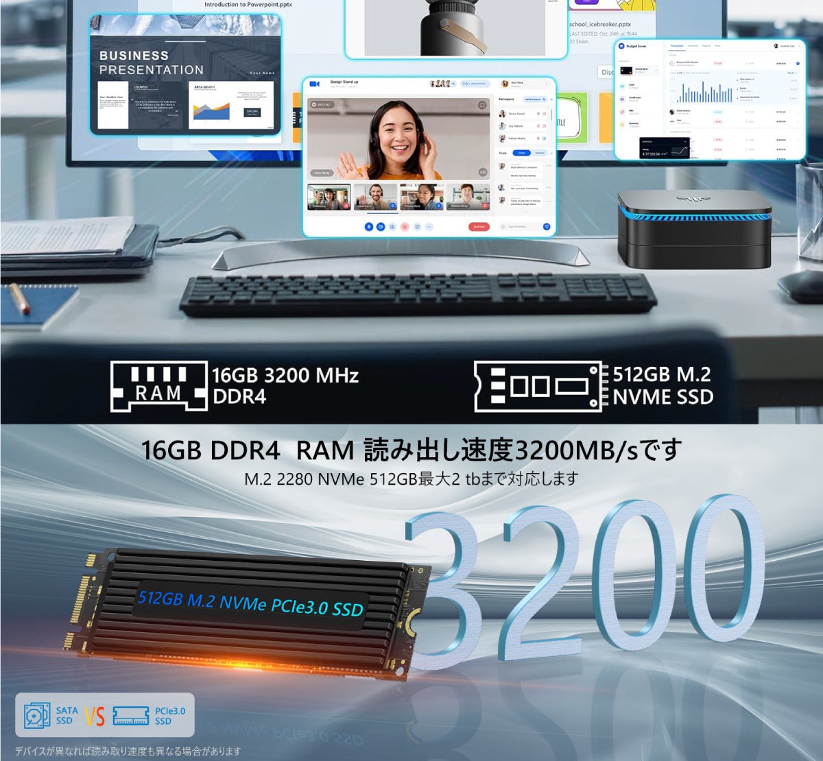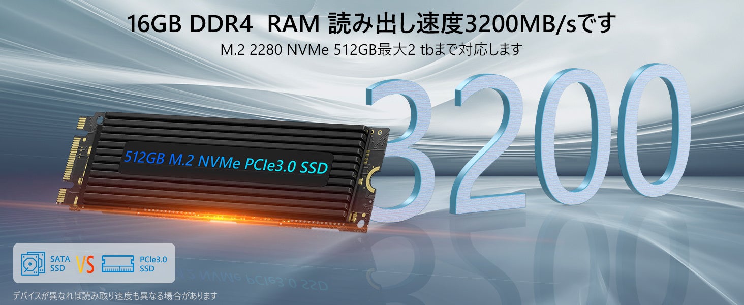 小型pcは高速16GB DDR4 3200MHz 512GB(最大2TBまで換装可)M.2 NVMe PCle3.0 SSDを搭載しています。DDR4高週波メモリは、システム全体の応答性を高め、非常に速く、ラグやジャンプがありません。加えて2.5インチsata ssd / hddスロットを増設することも可能で、ビデオや画像、ファイルなを大量に保存できる。(換装用のメモリとSSD/HDDは含まれない)超高速PCIe SSDをサポートするから、SATA SSDより読み書きスピードが8倍ぐらいはやいです。