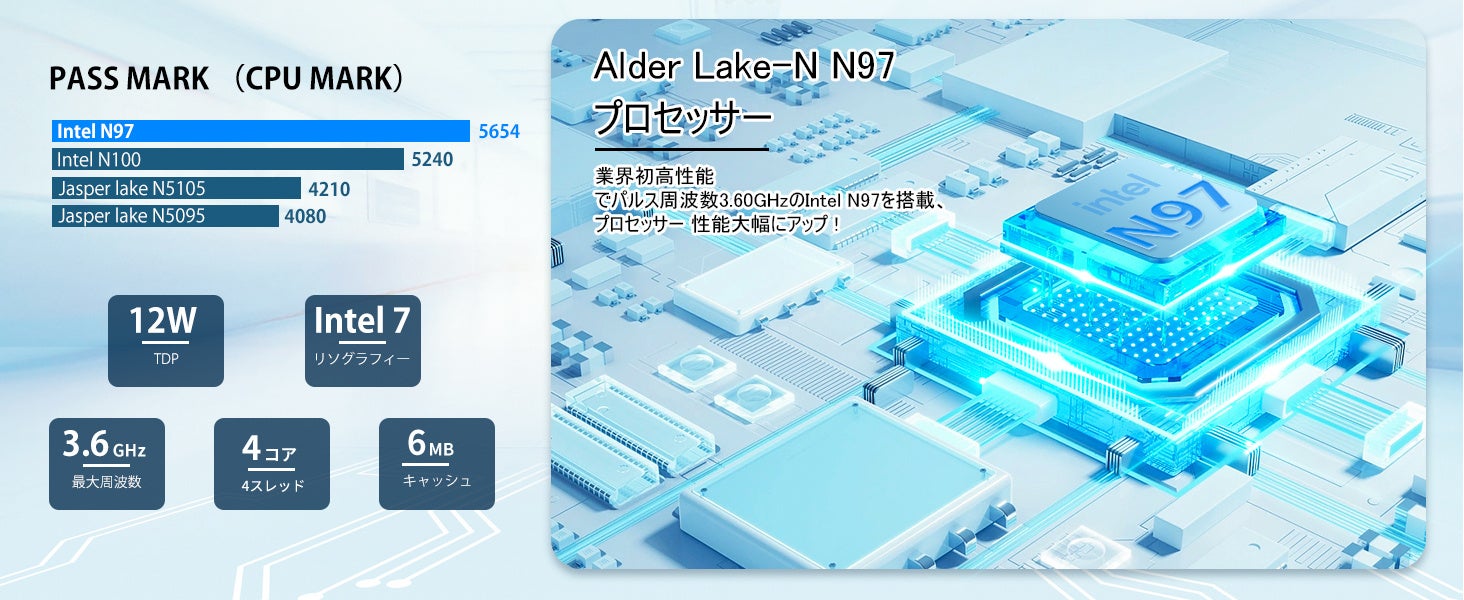 高性能で低消費電力のパルス周波数最大3.60GHzのAlder Lake-N97(6Mキャッシュ、4コア4スレッド)を搭載でAlder Lake-n100 ミニpcより18%アップ!