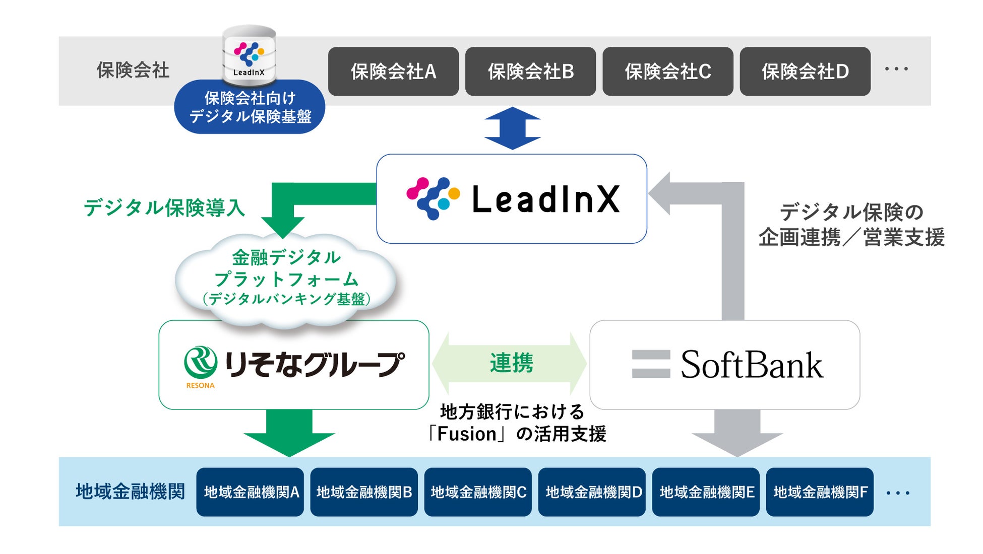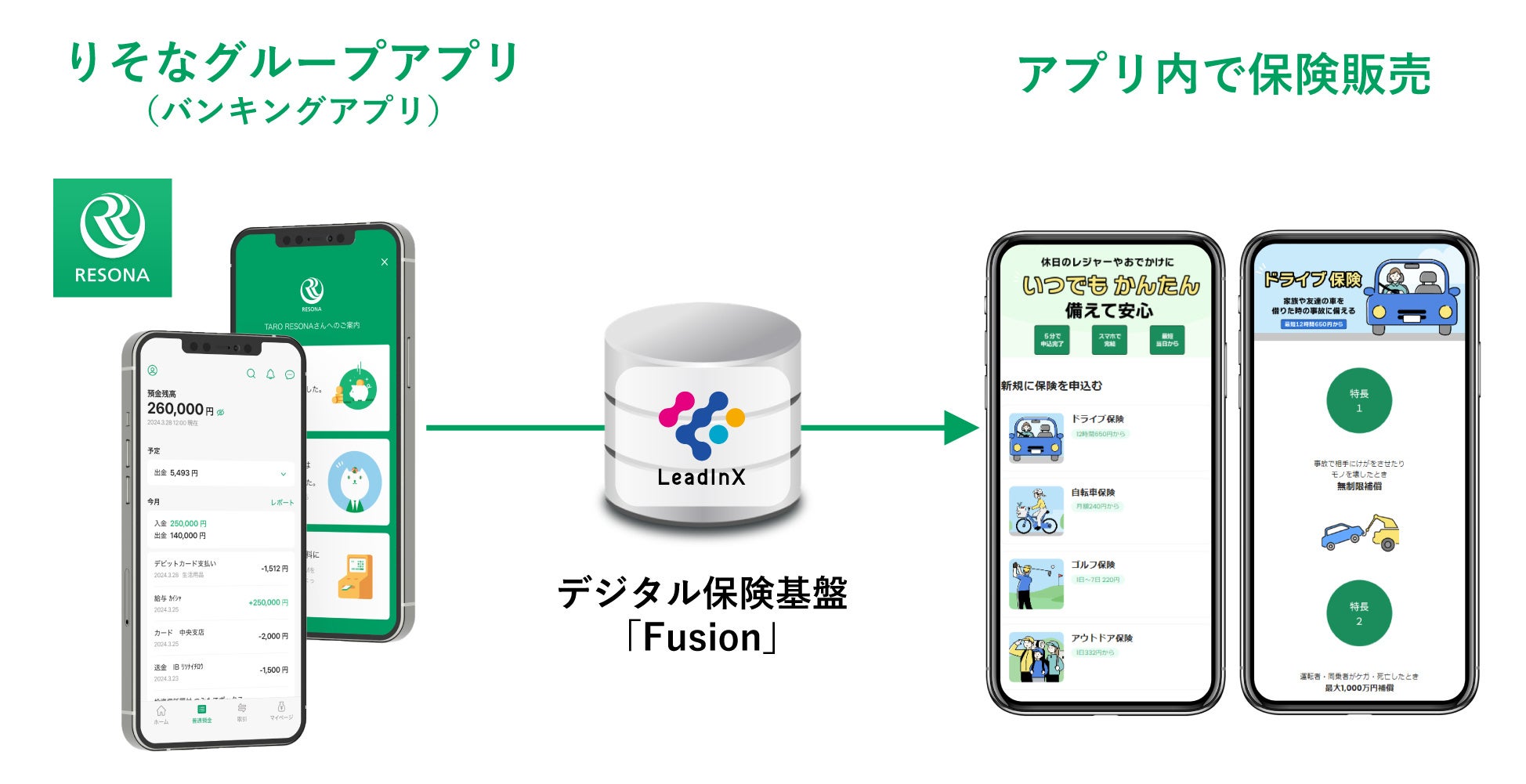 リードインクス株式会社(東京都港区、代表取締役社長 兼 CEO 柏岡 潤、以下「リードインクス」)およびソフトバンク株式会社(東京都港区、代表取締役 社長執行役員 兼 CEO 宮川 潤一、以下「ソフトバンク」)は、株式会社りそなホールディングス(東京都江東区、取締役兼代表執行役社長兼グループCEO 南 昌宏、以下「りそなグループ」)と協業し、非対面チャネルでの保険商品の販売強化に向けた取り組みを推進します。この一環として、りそなグループはリードインクスが提供するデジタル保険基盤「Fusion(フュージョン)」を導入し、「りそなグループアプリ」※1において即日加入できる損害保険の取り扱いを本日から開始します。りそなグループは銀行業界として初めて「Fusion」を導入し、「りそなグループアプリ」上に「損害保険」のメニューを新たに追加します。りそなグループへの導入においては、ソフトバンクが企画の立案とリードインクスへの営業支援を行っています。
