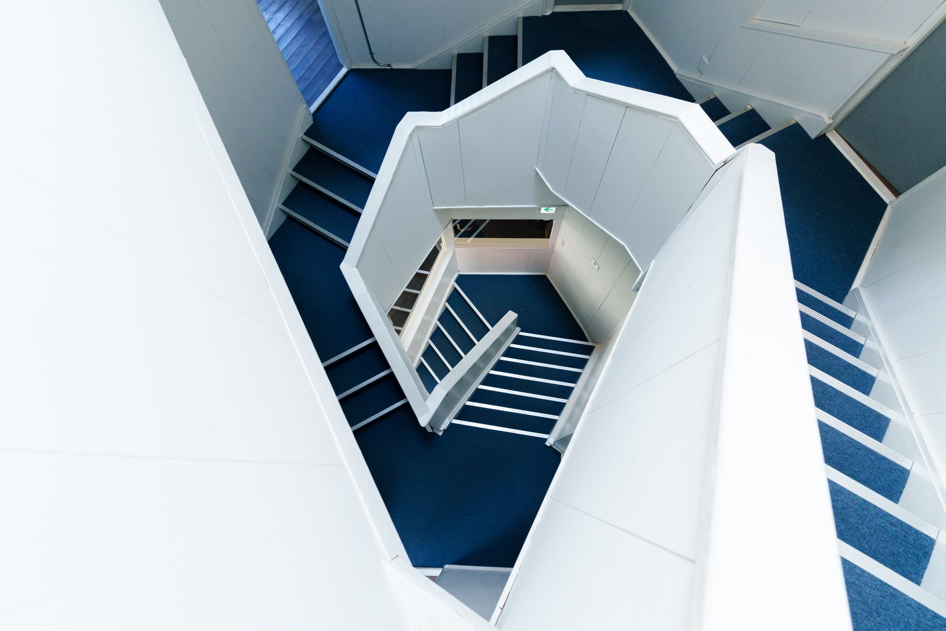 ・内部構造:中央に吹き抜けのらせん階段を配置し、宿泊室は放射状にレイアウトされています。