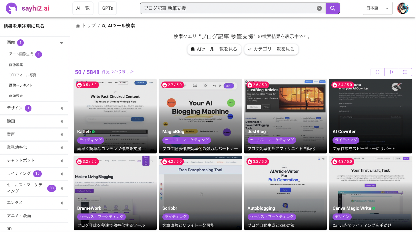 「sayhi2.ai」では、「ブログ記事 作成支援」「スライド自動生成」といったように、目的を検索ワードとして入力すると、厳選されたAIツールのみが検索結果として表示されます。それゆえ、簡単かつ効率的にAIツールを探すことができます。
