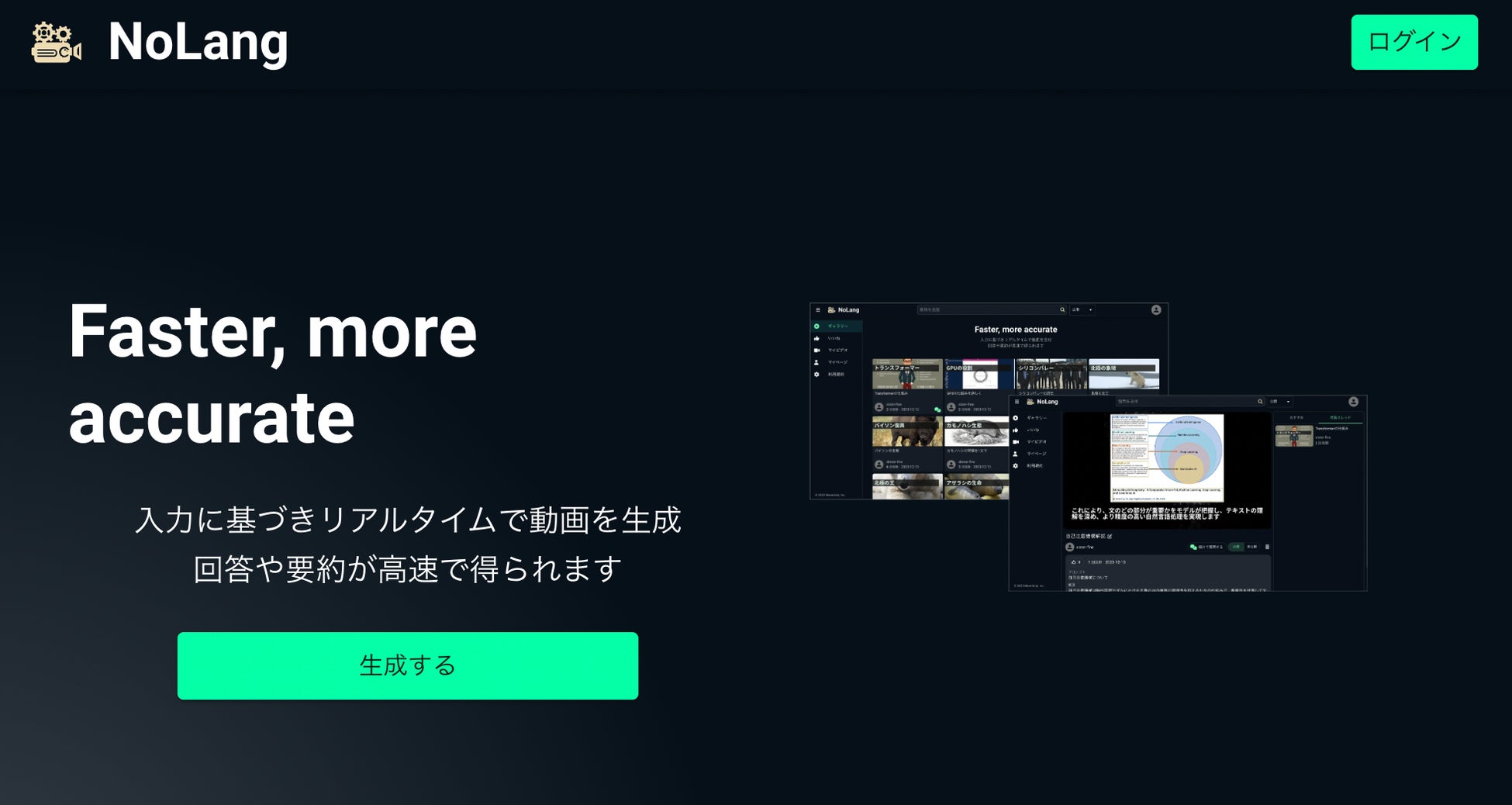 Nolang は、テキストで質問を入力すると、回答内容を自動で読み上げる動画を生成するサービスです。画像生成はもちろん、text2video, text2speechなど様々なAIを同時に体感できる新感覚の高速生成体験を提供します。