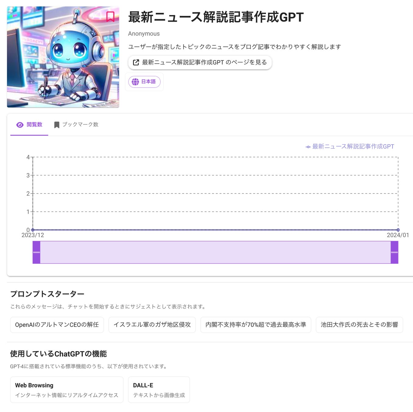 また、プロンプトスターター(最初に行う質問のサジェスト)やGPTsの有する拡張機能(画像生成、pythonコード実行、ウェブ検索)も掲載されており、使用時のイメージを膨らませたり、どんなスキルを有しているか見極めることができます。