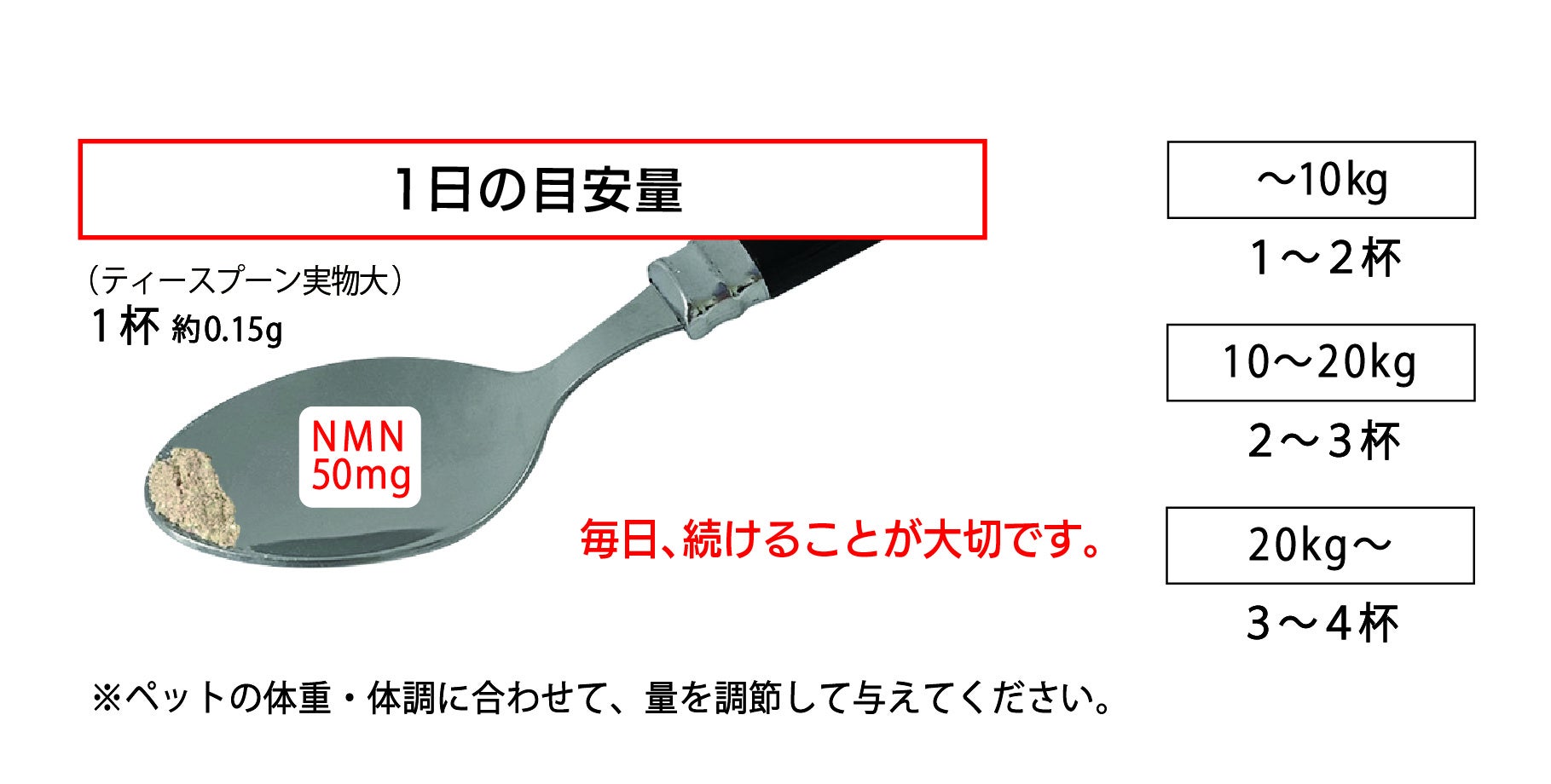 そんな悩みを抱える多くの飼い主さんから喜びの体験談をいただき、これまで以上にたっぷりと与えて、健康をご実感いただけるように、価格はそのままでNMN4500mgからNMN6000mgに増量リニューアルいたしました。