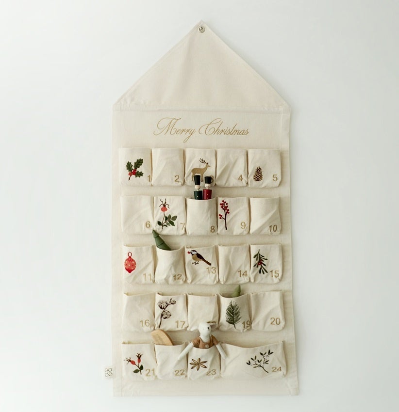100%コットンで織られたアドベントカレンダーには、クリスマスならではのモチーフが丁寧に刺繍されています。