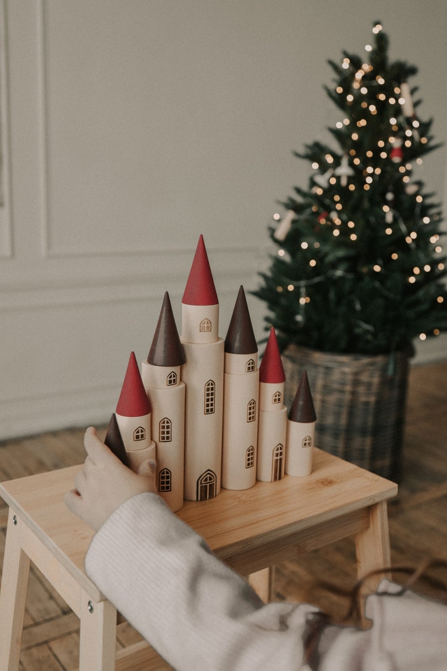 様々な形のパーツで構成された積み木セット。おとぎ話に出てくるお城をイメージしています。