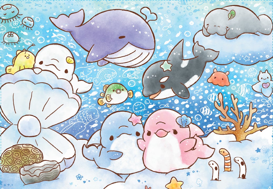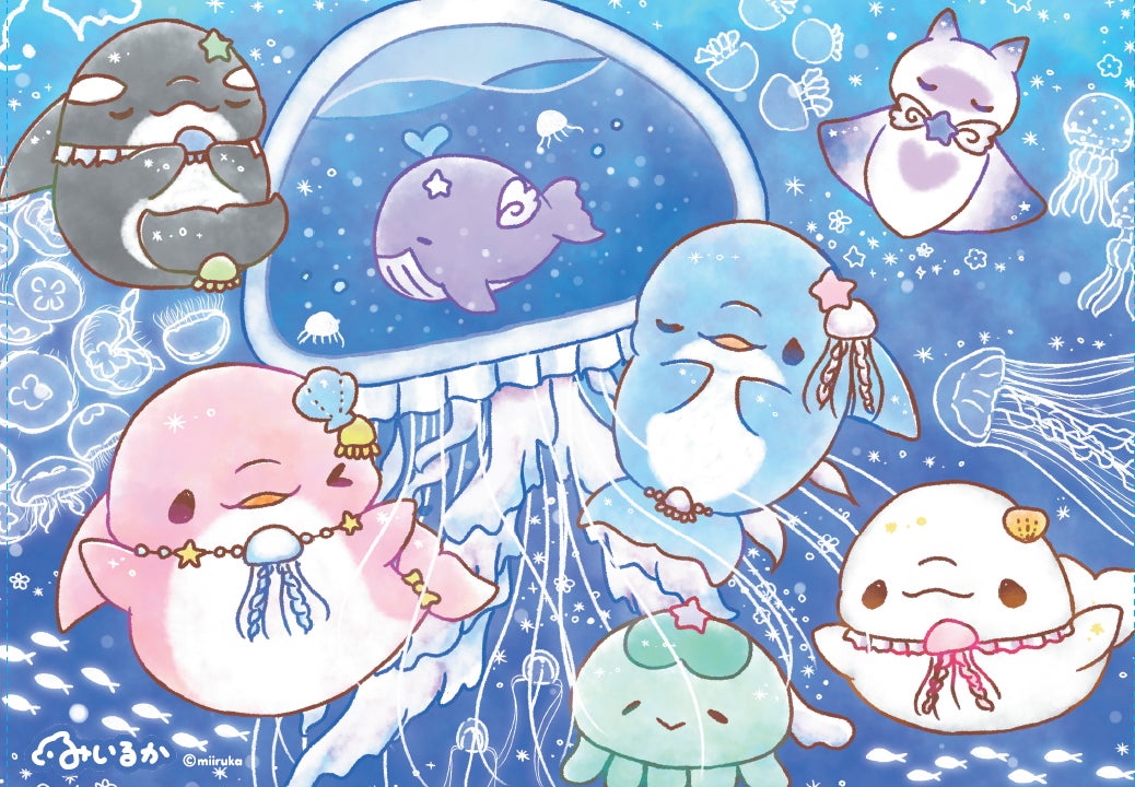 みいるかが描く、特徴的な雫型の目をしたゆるくてかわいいイルカとその海の仲間たちが楽しく生活している様をデザインしています。
