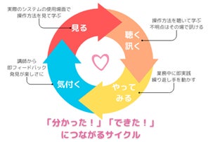 一般的な座学研修であれば、いざ翌日の業務でシステムを使おうとした際に「あれ?」と困る場面がでてきてしまうものです。人間の脳は一度覚えたことを1時間後には半分忘れ、1日後には7割忘れるという研究もあるように、忘れてしまうのは当然のこと。忘れないためには、五感を使って実際に「体験する」こと、そしてその体験を「積み重ねる」ことが大切です。「べったりプラン」は、業務の中で繰り返しトライすることが可能です。「できた!」から主体性が生まれ「楽しい!」に繋がる、そんな研修となっています。