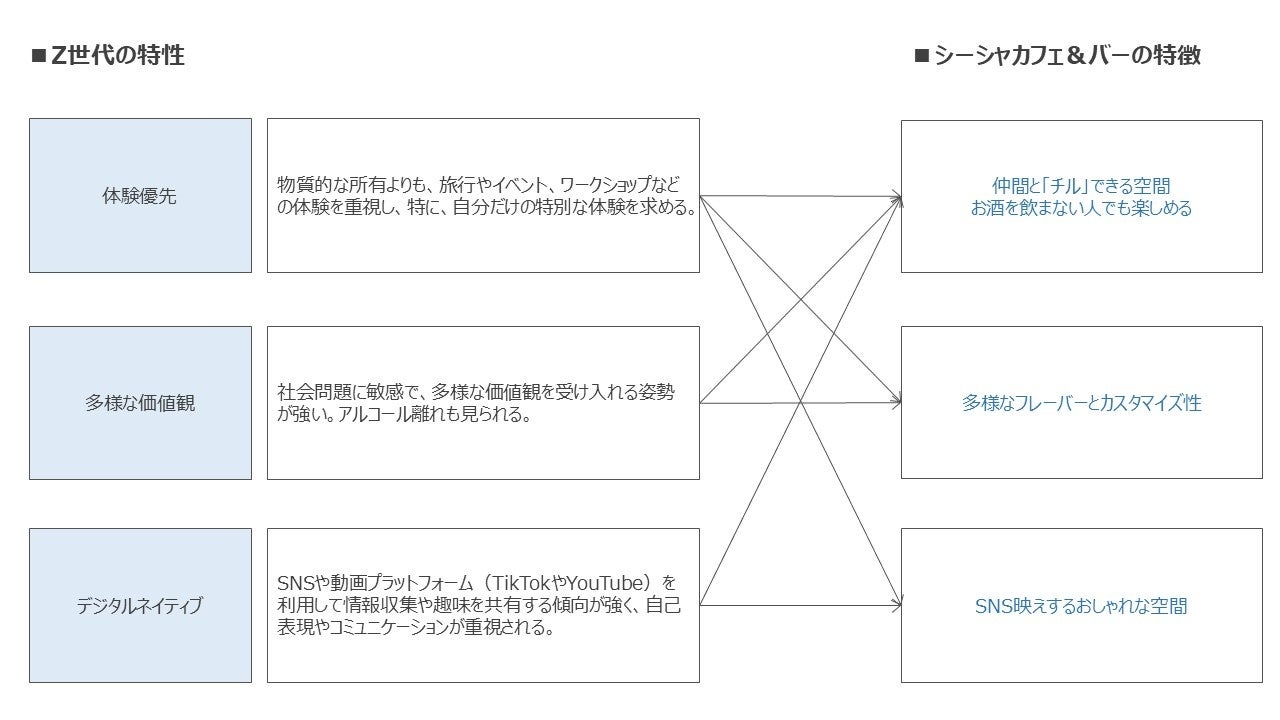 シーシャはZ世代の特に非喫煙者の女性の間でブームが起こりましたが、Z世代の特性とシーシャカフェ&バーの特性はこのように紐づけることが可能です。