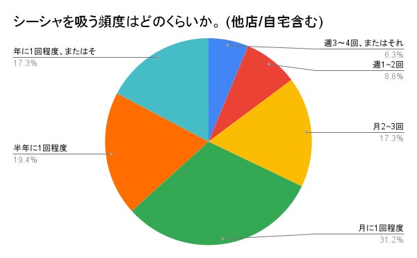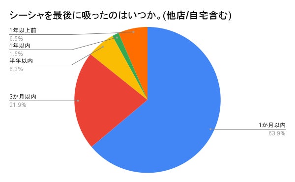 そして、シーシャを最後に吸ったのが1か月~3か月以内という比較的最近に吸った方が85%、月に1回程度以上の高頻度で吸う方が60%を超える結果となりました。