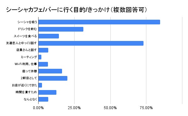 訪れたきっかけは、ほとんどの方がシーシャを吸うこと、友達・恋人とゆっくり話すこと、もしくはその両方でした。