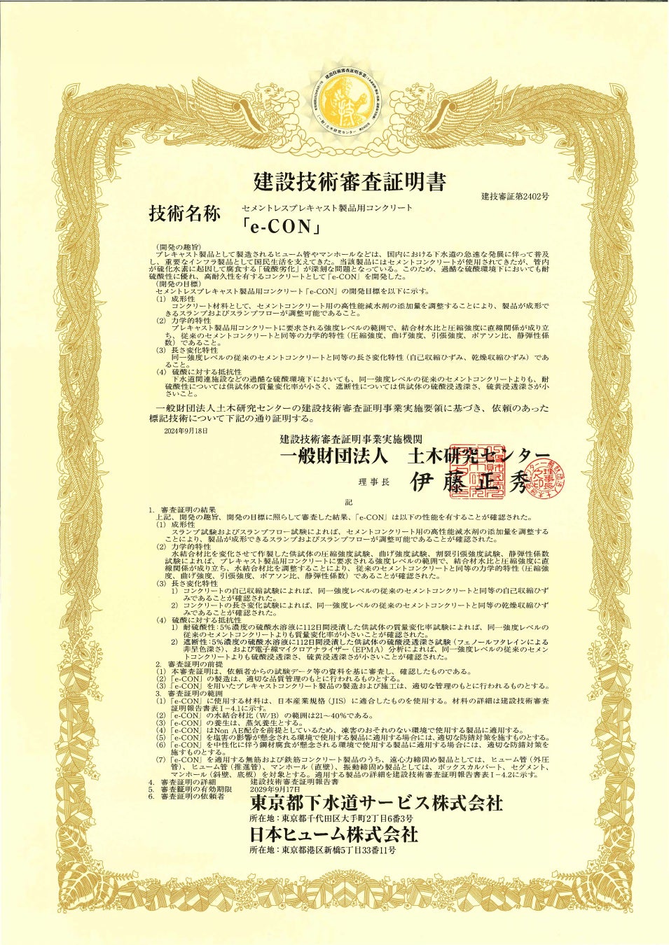 一般財団法人 土木研究センター 建技審証 第2402号 ( 有効期限:2029年9月17日)