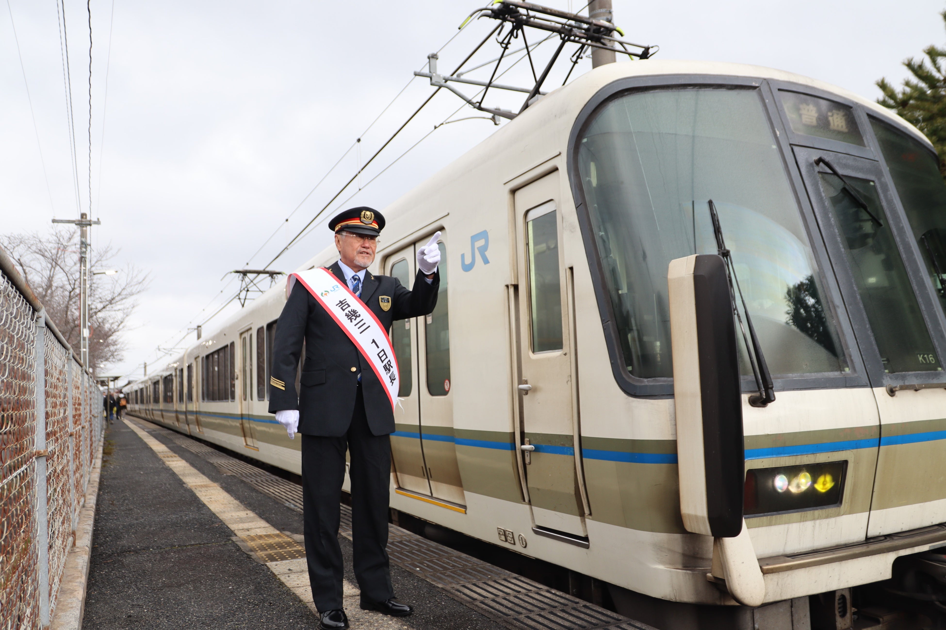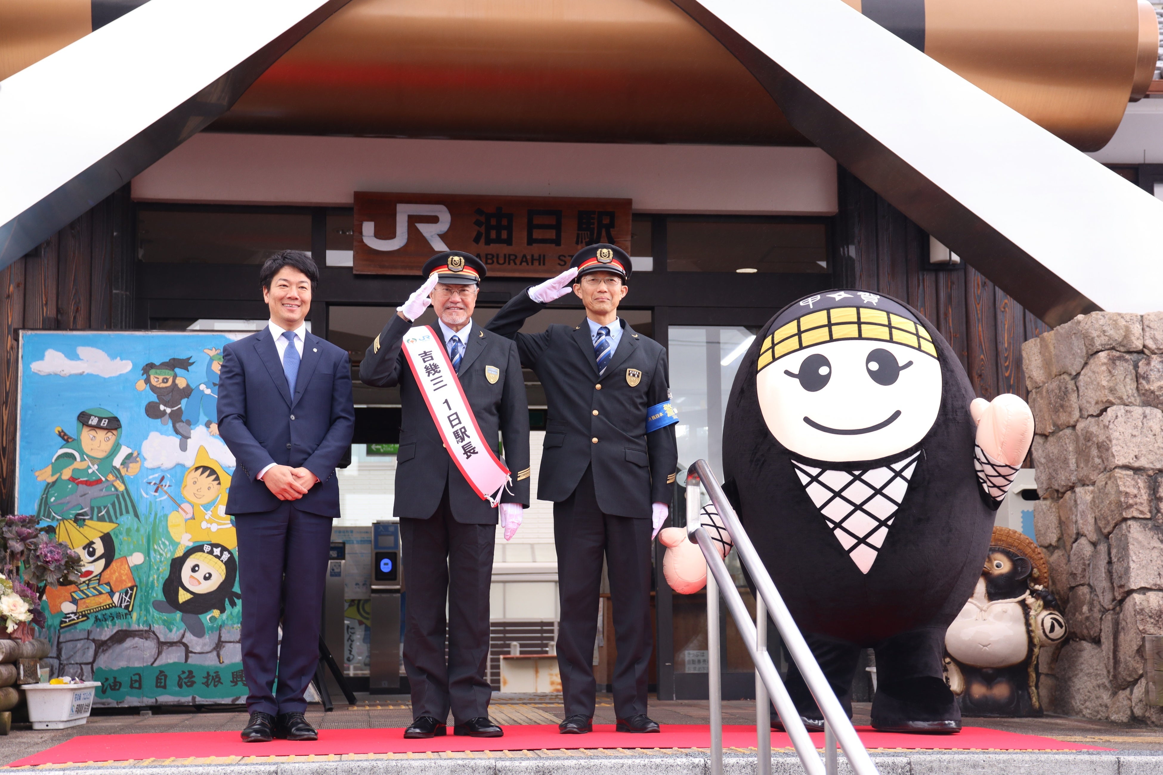 令和6年2月18日(日)に甲賀市観光まちづくり協会観光PR大使である吉幾三氏を、JR草津線の1日駅長として任命し、その任命式を行いました。任命式では、鉄道会社の制服姿で現れた吉幾三さんが、JR草津駅長から制帽と1日駅長のたすきを受け取り、「出発進行!よしいくぞう!」と出発の合図を送りました。