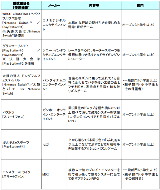 フェスティバル」、「パズドラ」、「ぷよぷよeスポーツ」、「モンスト」の6種目で実施し、優勝者には東