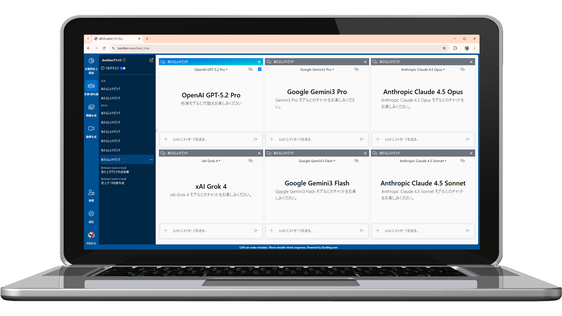 複数LLM同時質問:同じ質問を複数モデルへ並列に投げ、回答を比較検討できる