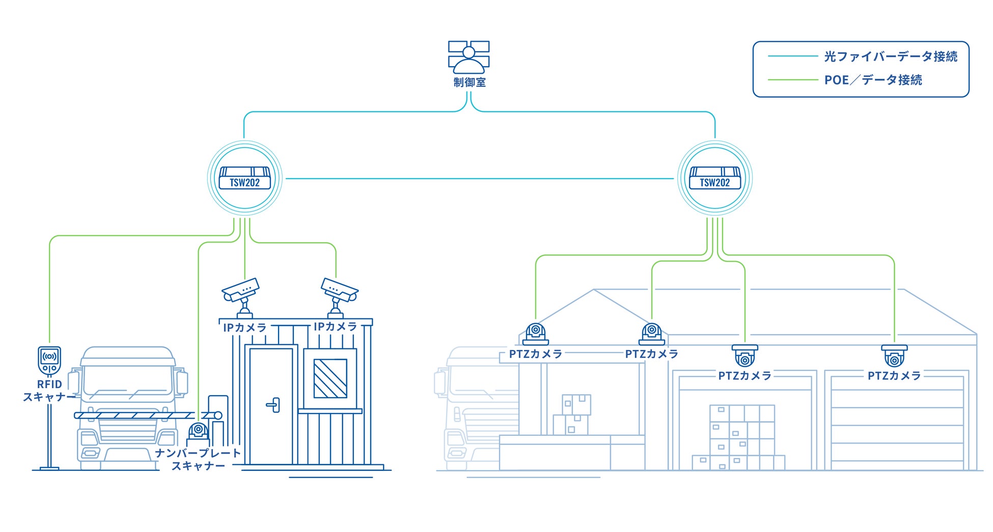 スマート物流倉庫では、監視カメラを用いたナンバープレート認識によるトラック配備、スタッフの活動状況、RFIDスキャナとの通信、外部からの侵入による盗難対策など複合的な要素をシームレスに一つの制御システムに統合しています。
