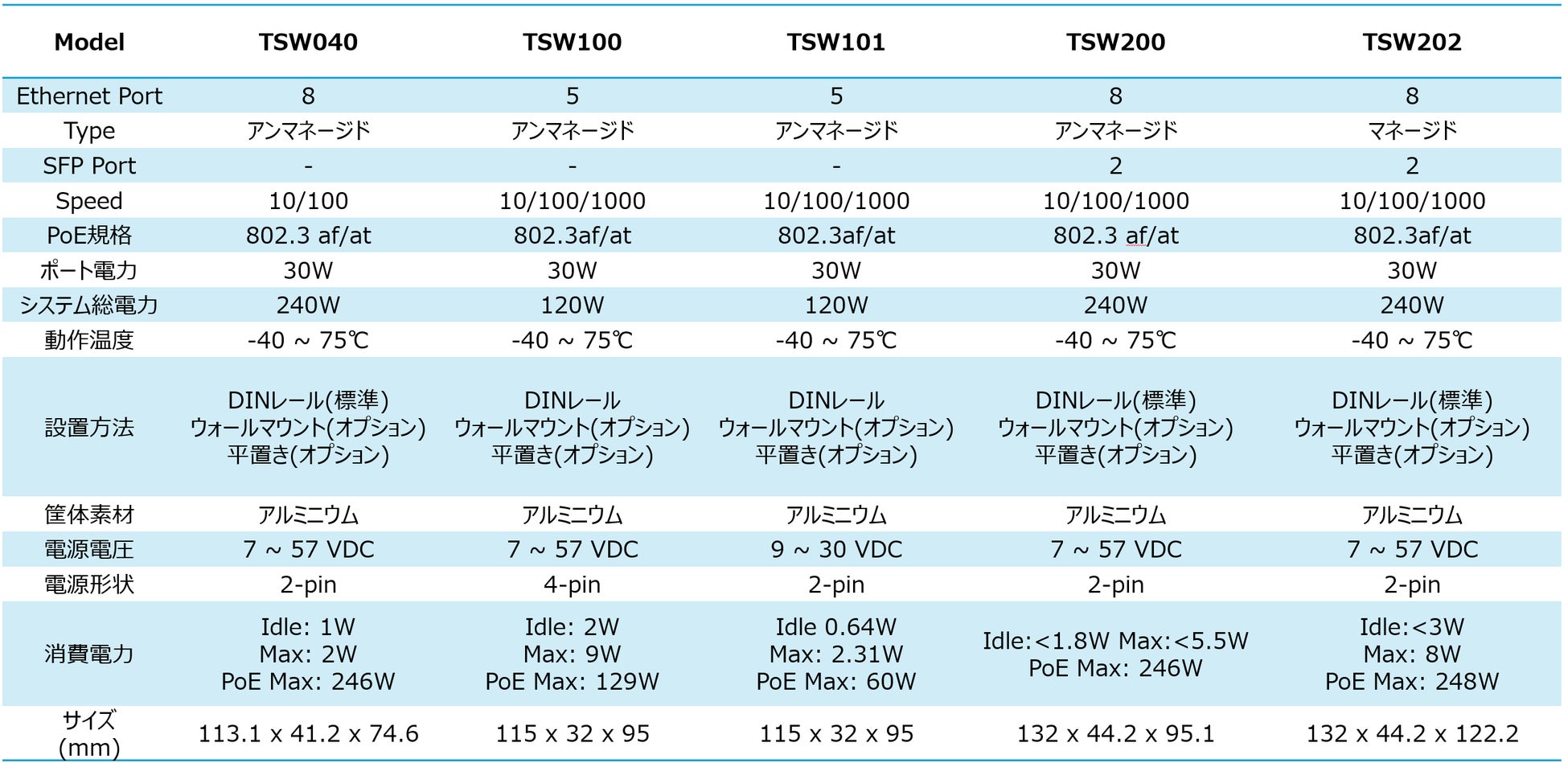 TSW202は、産業用マネージドPoE+スイッチです。PoE+対応のGbEを8ポート有し、QoSとポート管理を強化、Profinet・EtherNet/IP・MRPなどの産業用ネットワークプロトコルにも対応したデバイスです。
