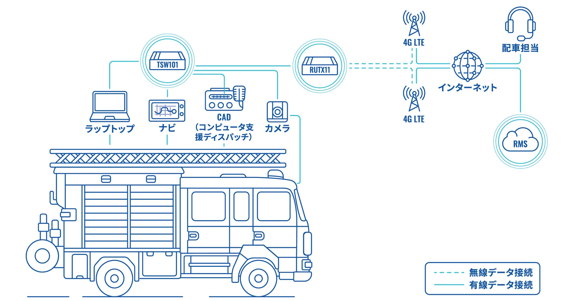 12V程度の低電圧でパワフルなPTZ監視カメラを駆動することができ、かつ消防車内に搭載される様々な機器をつなげられることから消防車内の省配線と設置の柔軟性を高めることができ低電圧駆動のデバイスは大きなメリットを提供しています。