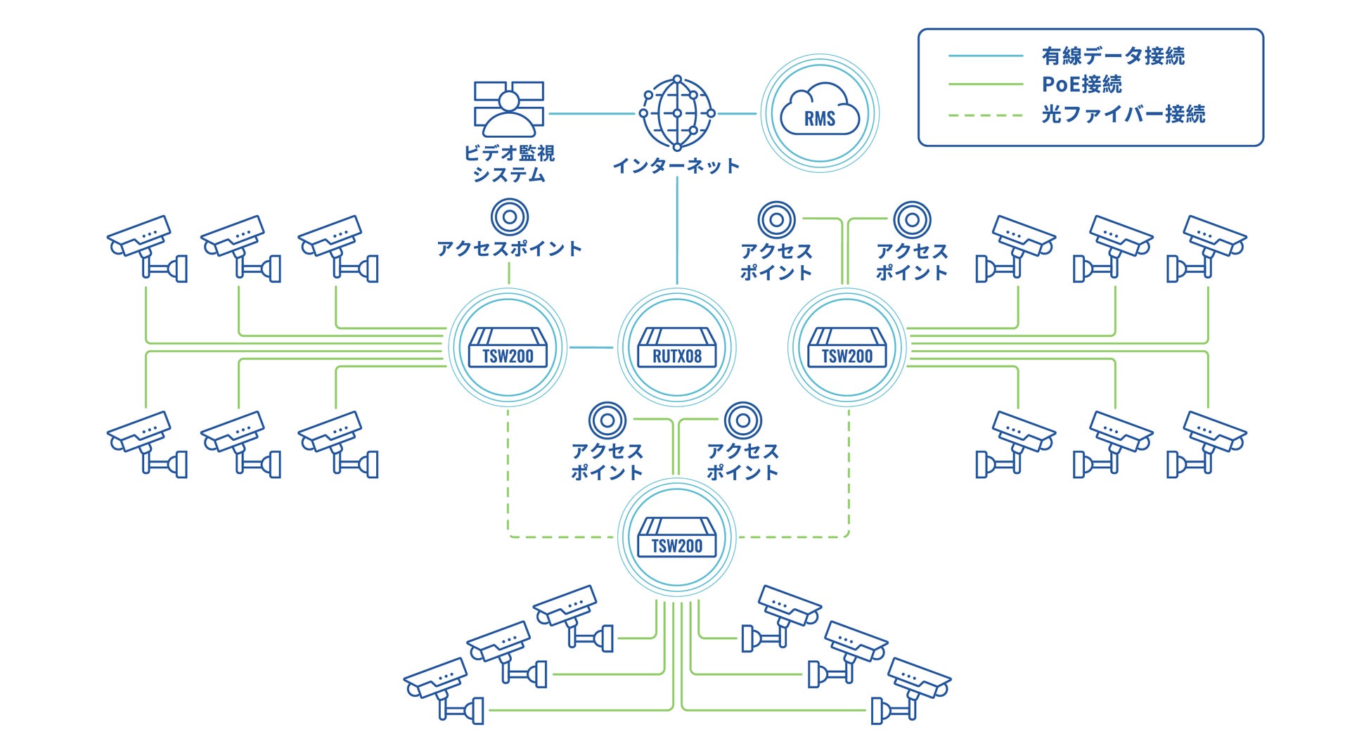 TSW200は、PoE+対応のGbE(ギガビットイーサネット)を全8ポート、最大240Wの総電力を持ちますので、パワフルなPTZ監視カメラなどにも安定的な電力供給が可能となります。