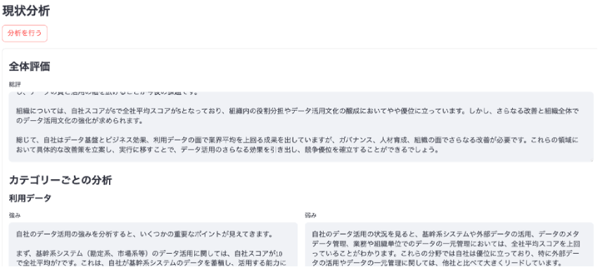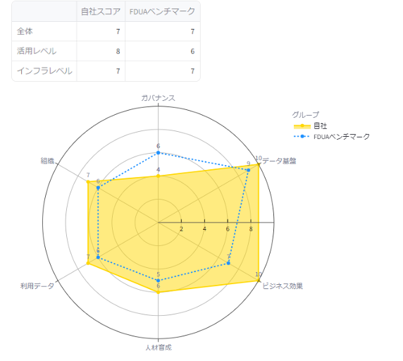 回答結果に合わせた具体的な示唆および助言を提供することで、自社のデータ活用レベルをより俯瞰して捉える事が可能になると期待しています。