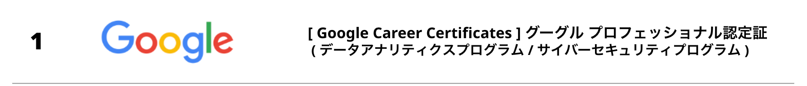 キャリアアップにつながる Google の認定資格プログラムです。実践的な知識と問題解決能力を身につけ、組織における即戦力となる人材を育成することを目的としており、今までの経歴や学歴を問わずどなたでも受講可能です。データアナリティクスプログラムとサイバーセキュリティのプログラムを日本語で提供しています。