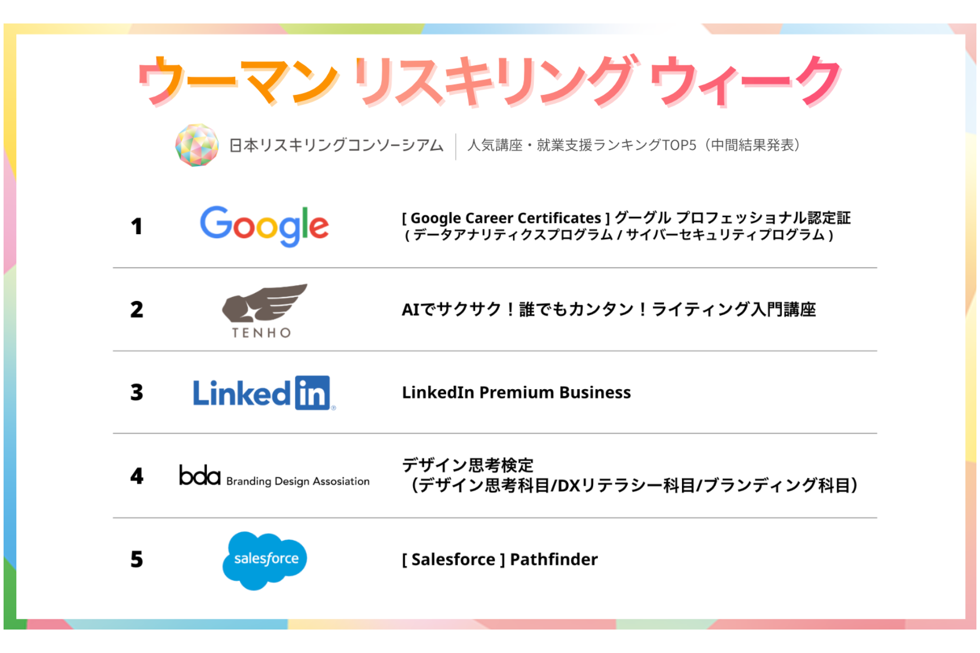 総額約3億円分の講座・就業支援を無料提供する「ウーマンリスキリングウィーク」人気ランキング 中間結果発表