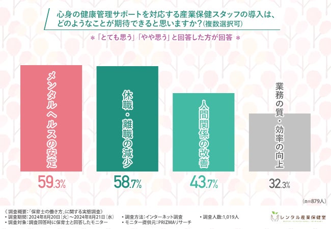 産業保健スタッフの導入で期待できることTOP3は『メンタルヘルスの安定』『休職・離職の減少』『人間関係の改善』