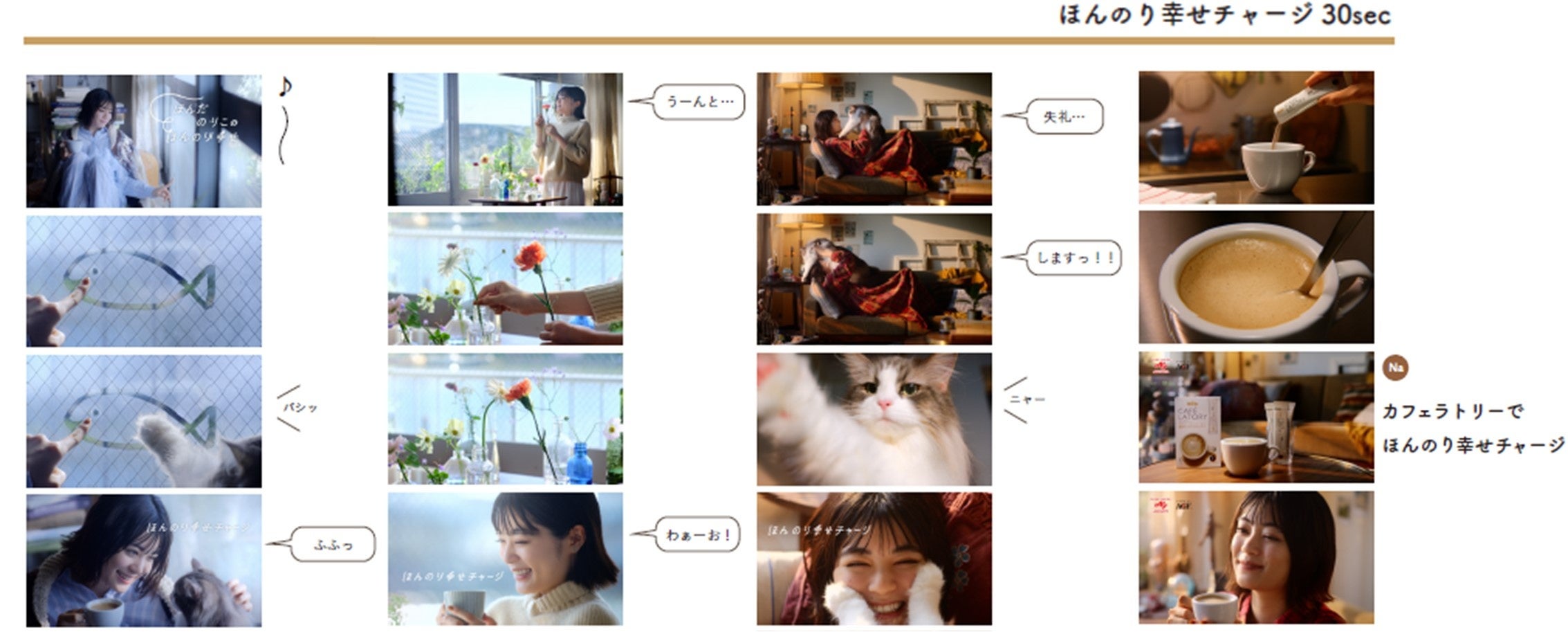 窓が結露するような寒い朝、窓際で温かいカフェラテの入ったマグカップを持つのりこさん。曇ったガラスに魚のイラストを描きながら愛猫ラテと過ごすほっこりした時間が流れるシーンから始まります。昼にはお花をお気に入りの花瓶に小分けして、偶然の可愛らしい動きに思わず微笑み、夕方はソファに寝ころびながら愛猫ラテとじゃれあい、《「ブレンディ®カフェラトリー®」スティック》を飲んで『ほんのり幸せチャージ』をしている、といったような思わず共感してしまうシーンで、視聴者を温かく包み込みます。