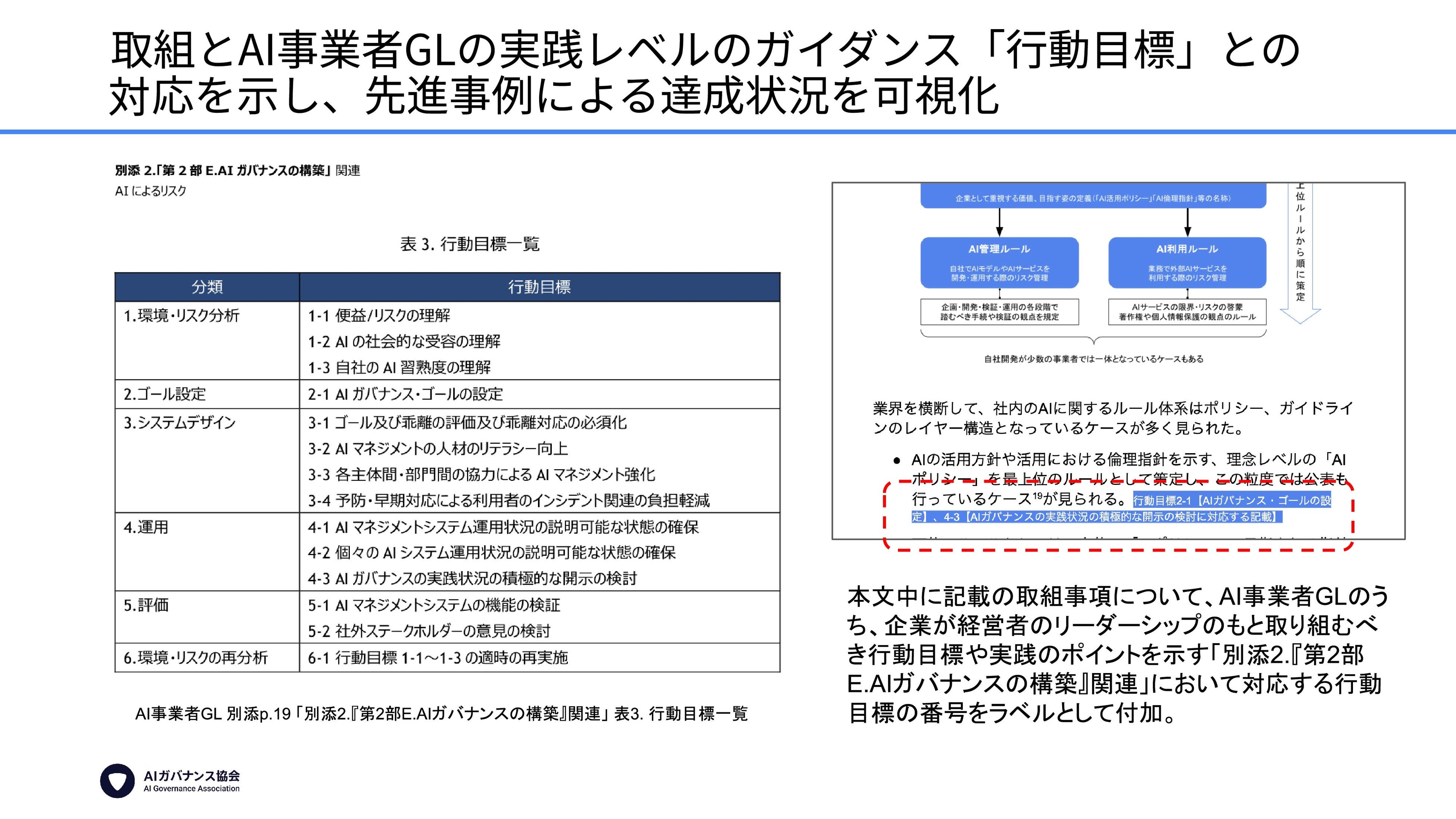 ワーキングペーパーの執筆にあたっては、AIGA会員による先進的な取組の達成状況や、課題も含めた今後の展望について、「AI事業者ガイドライン(第1.0版)」の「別添2.『第2部E.AIガバナンスの構築』関連」における行動目標への対応状況も明示しつつ整理を行いました。これにより、現時点での企業によるAIガバナンス実践の具体的な手がかりや、業界を横断した共通の課題感について官民横断での共通理解の醸成に資することを目指しています。
