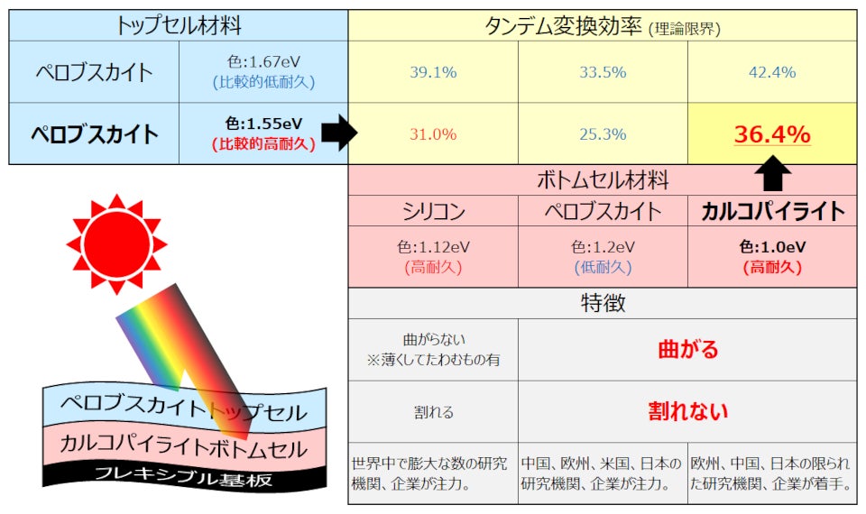 ペロブスカイトとカルコパイライトはどちらもフレキシブル基板を用いることが可能な材料ですが、フレキシブル型はリジッド型よりも高度な技術を要するため、基礎研究ではリジッド型が用いられる事がほとんどです。リジッド型のペロブスカイト/カルコパイライトタンデム太陽電池では、スイスとシンガポールの研究機関が共同で1.63eVの色のペロブスカイトを用いて変換効率29.9%を、ドイツの研究機関が1.62eVの色のペロブスカイトを用いて変換効率27.3%を、東京大学が比較的高耐久な1.55eVの色のペロブスカイトを用いて変換効率26.2%を実現しています。また、フレキシブル型ではペロブスカイトの色は不明でありますが、欧州の研究機関連合が変換効率21.5%を実現している他、中国の大学も変換効率21.5%を実現しています。