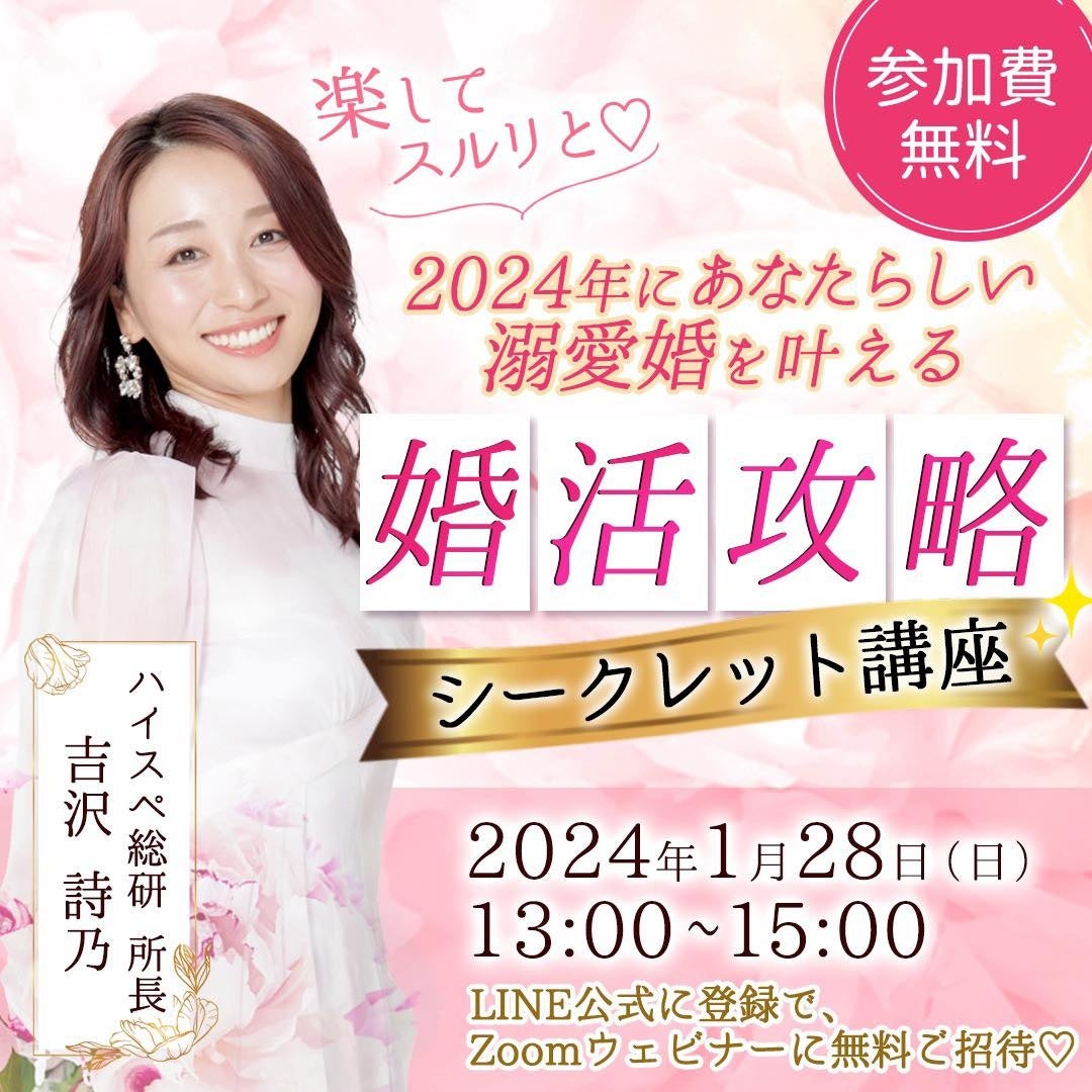 4ヶ月で理想の彼を作る恋愛・婚活塾「総研アカデミー」を運営するハイスペ男子総合研究所(株式会社はんなり、本社:東京都品川区、代表:吉沢詩乃)は、2024年1月28日(日)に2024年にあなたらしい溺愛婚を叶える婚活攻略シークレット講座を開催いたします。