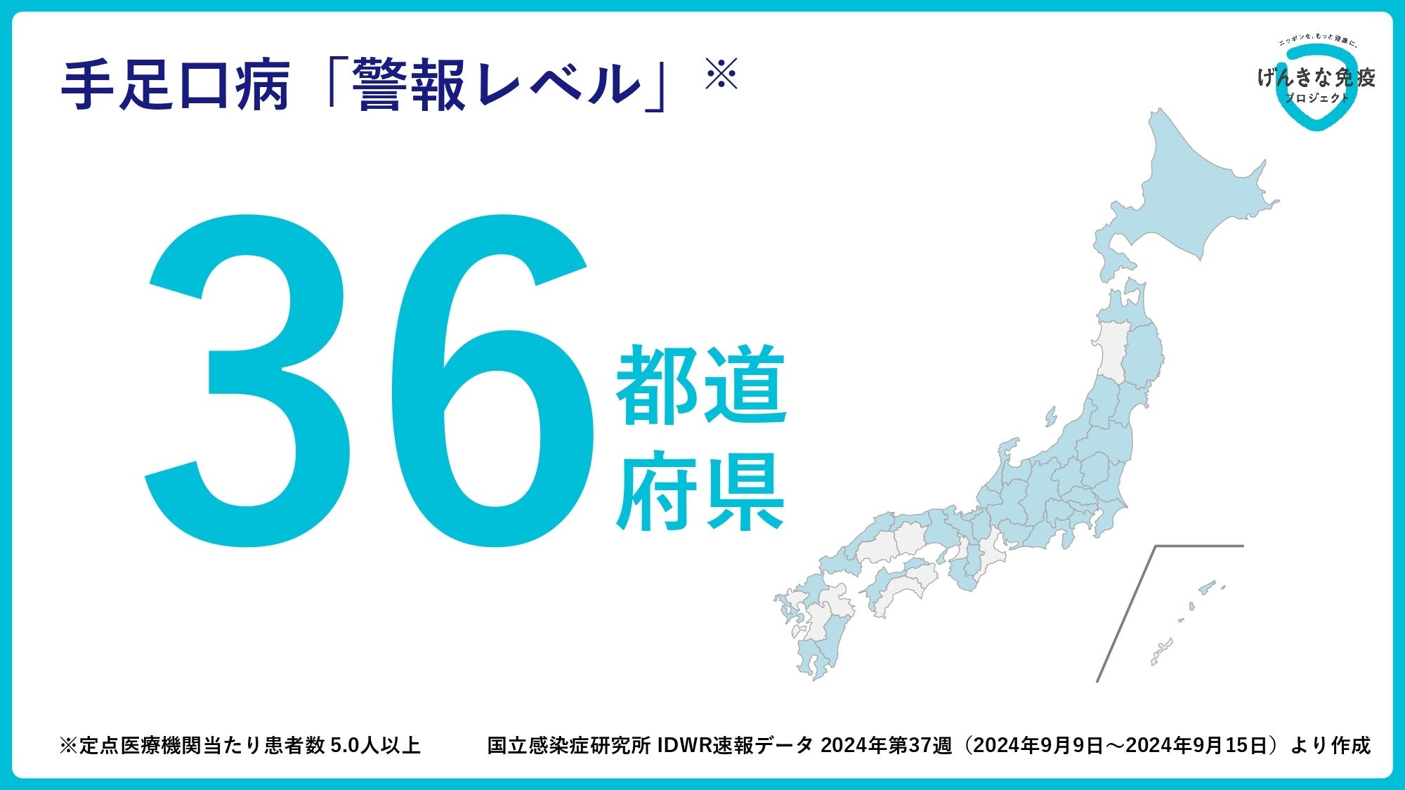 国立感染症研究所の調べによると、2024年9月9日(月)から9月15日(日)までの1週間(第37週)において、定点医療機関あたりの手足口病患者数が5.0人を超えて「警報レベル」に達したのは、36都道府県でした。夏に流行する傾向がある手足口病の患者数は、秋になっても引き続き高い水準で推移しています※4。