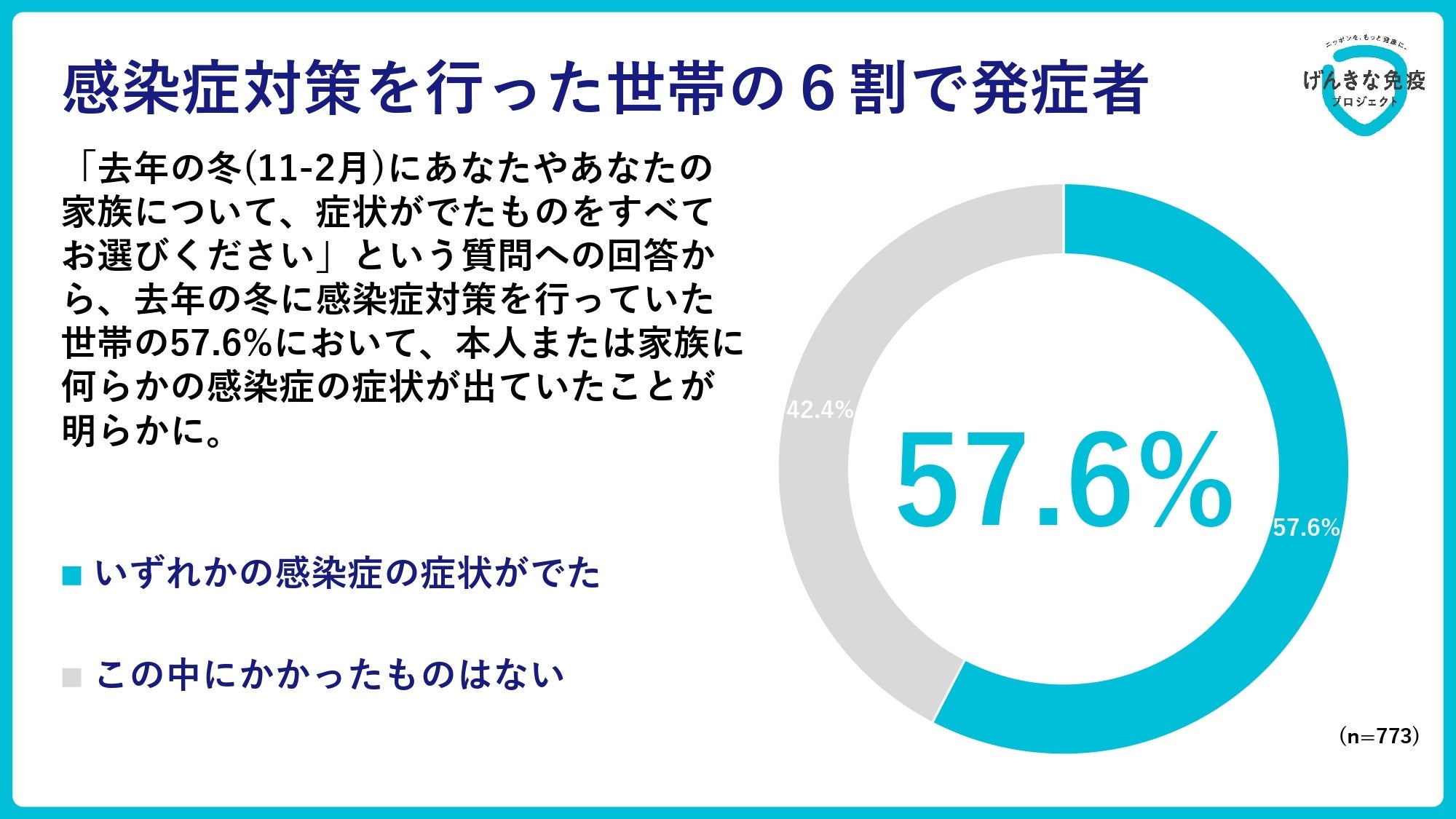 「以下の感染症のうち、去年の冬(11~2月)にあなたやあなたの家族について、症状が出たものを、それぞれ全てお選びください。」という質問では、対策を行っていた※6人のうち57.6%が、本人または家族に軽微な風邪を含む何らかの感染症の症状が出ていたことが明らかになりました。