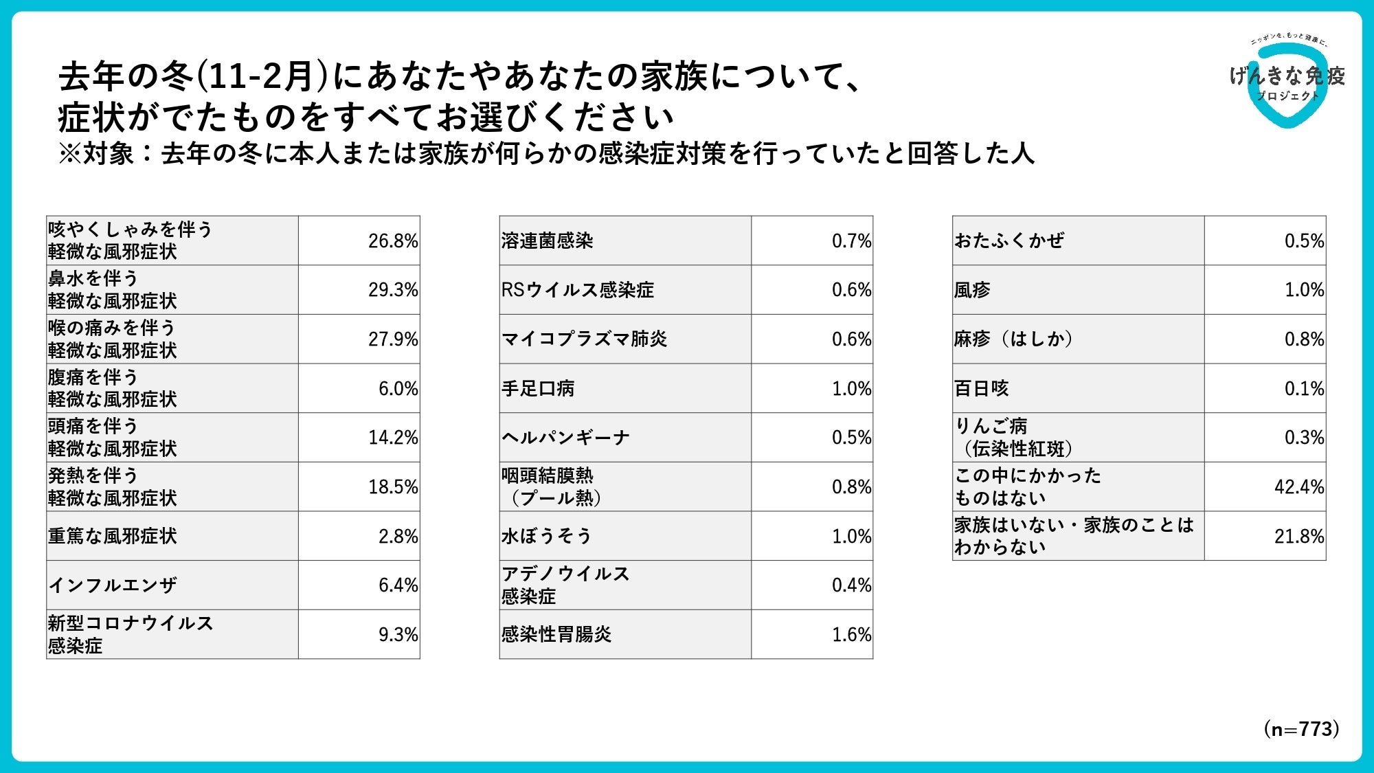 キリンホールディングス株式会社(社長 COO 南方健志)は、自分自身の体調を守るために重要な「免疫のケア」を啓発する官民連携活動「げんきな免疫プロジェクト」の一環として、2024年9月11日(水)~9月12日(木)の期間、全国の20~70代の男女1000人に「昨年冬の世帯感染率調査」を実施しました。