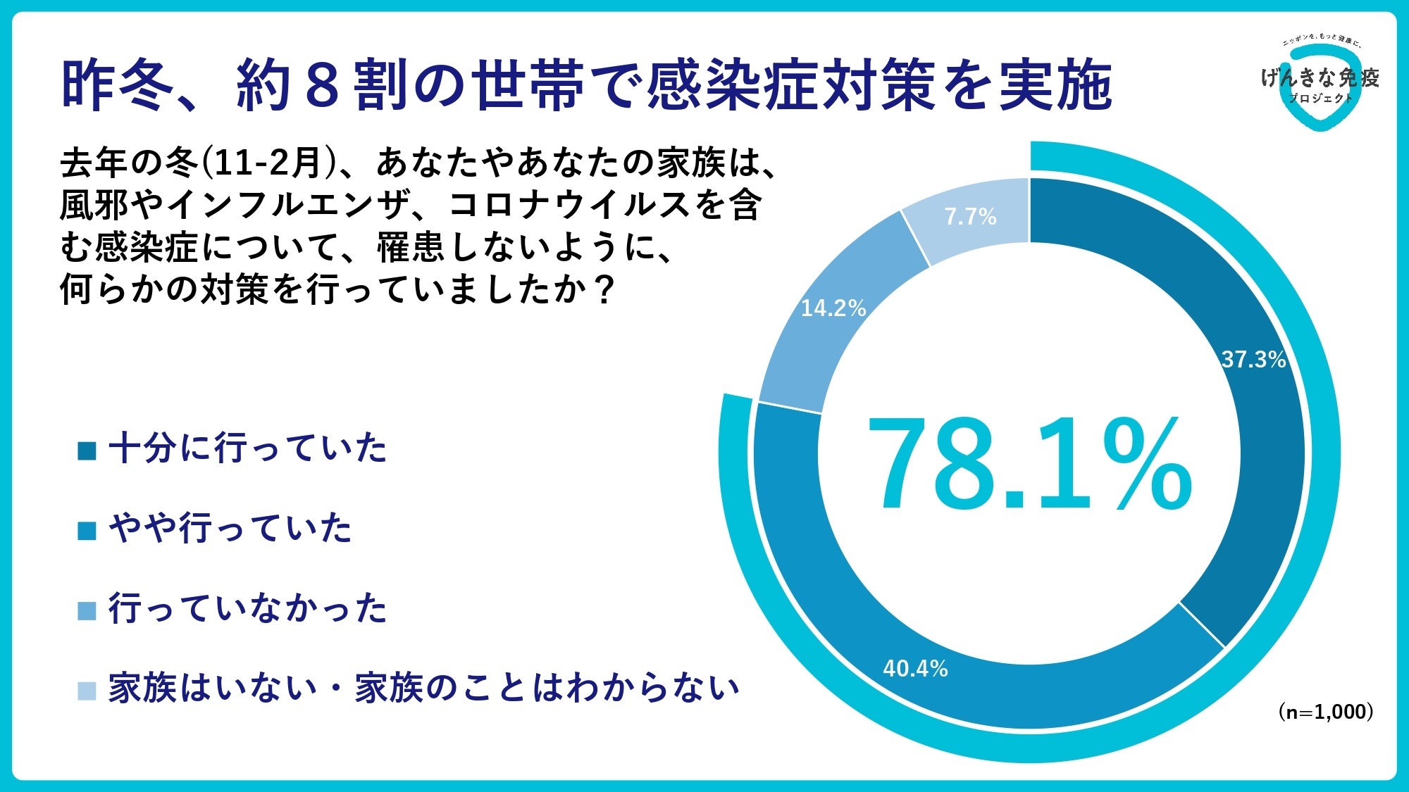 全国の20~70代の男女1000人を対象に行った「昨年冬の世帯感染率調査」によると、「去年の冬(11~2月)、あなたやあなたの家族は、風邪やインフルエンザ、コロナウイルスを含む感染症について、罹患しないように、何らかの対策を行っていましたか?」という質問に対して、78.1%の人が「十分に行っていた」または「やや行っていた」と回答しました。新型コロナウイルスの流行以降、大半の世帯においては、引き続き感染症対策が実施されていることがうかがえます。