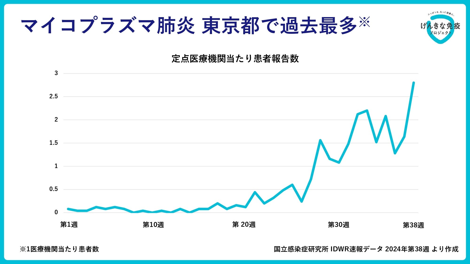 手足口病と同様に子供を中心に流行が広がっているのがマイコプラズマ肺炎です。東京都では2024年9月16日(月)から9月22日(日)までの1週間(第38週)に報告された1医療機関当たりの患者数は2.8人で、統計を開始した1999年以降、過去最多の患者数となっています※5。