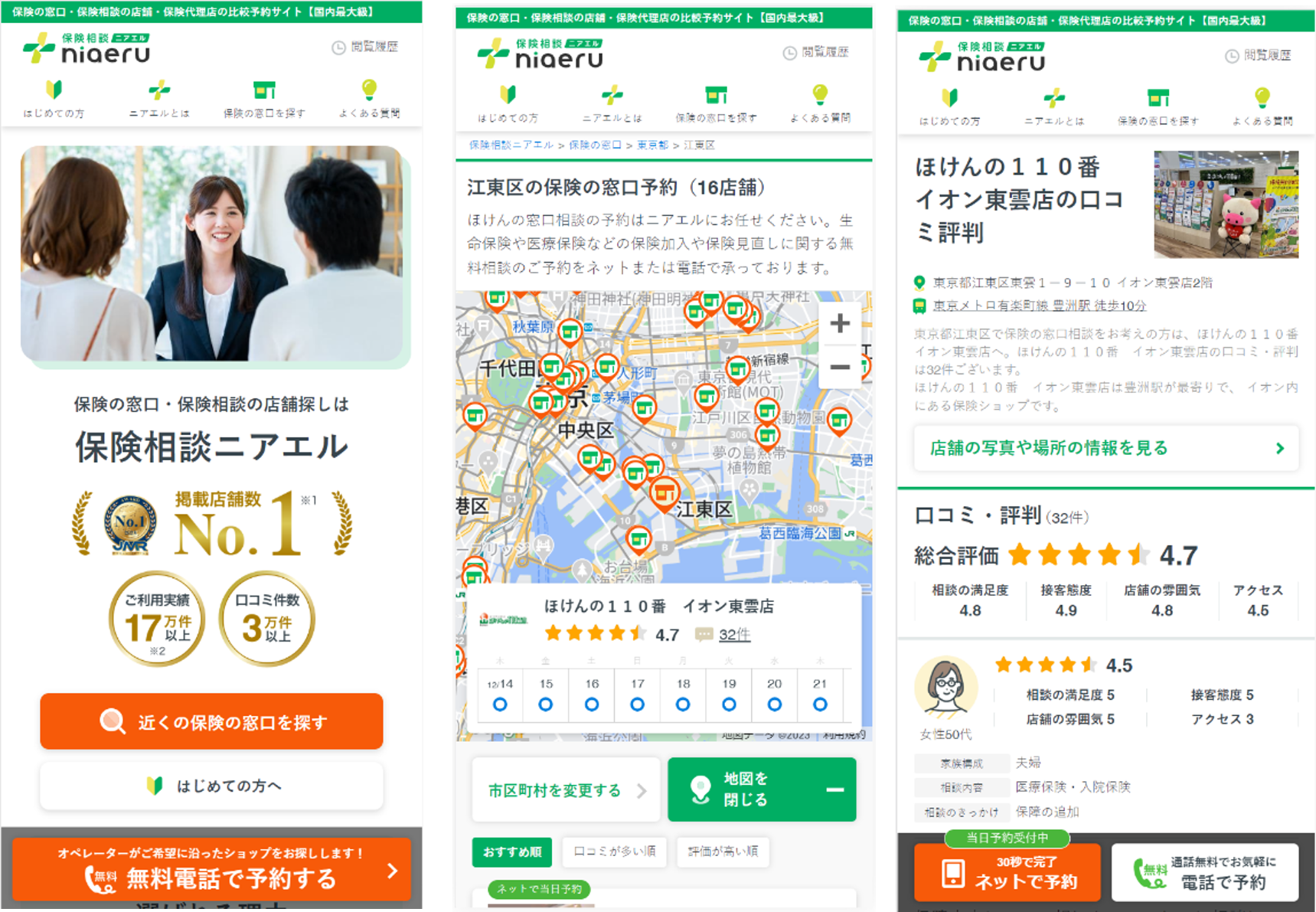 保険ショップ検索・予約サイト「保険相談ニアエル」では、全国の保険ショップを2,000店舗以上掲載しております(「掲載店舗数№1*」)。今後も、掲載店舗数やお客さまからの口コミ数など店舗情報の更なる充実を通じて、お客さまにとって最適な保険ショップのご紹介に努めてまいります。